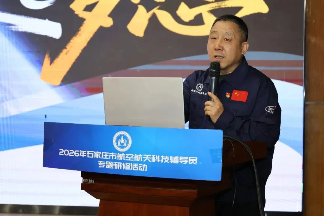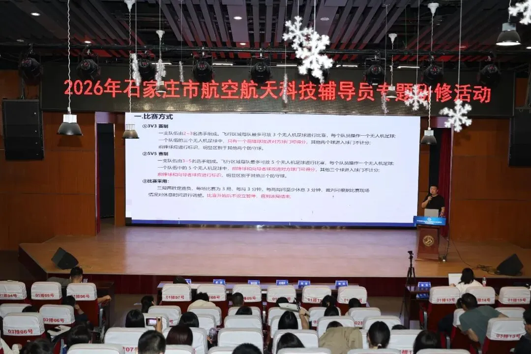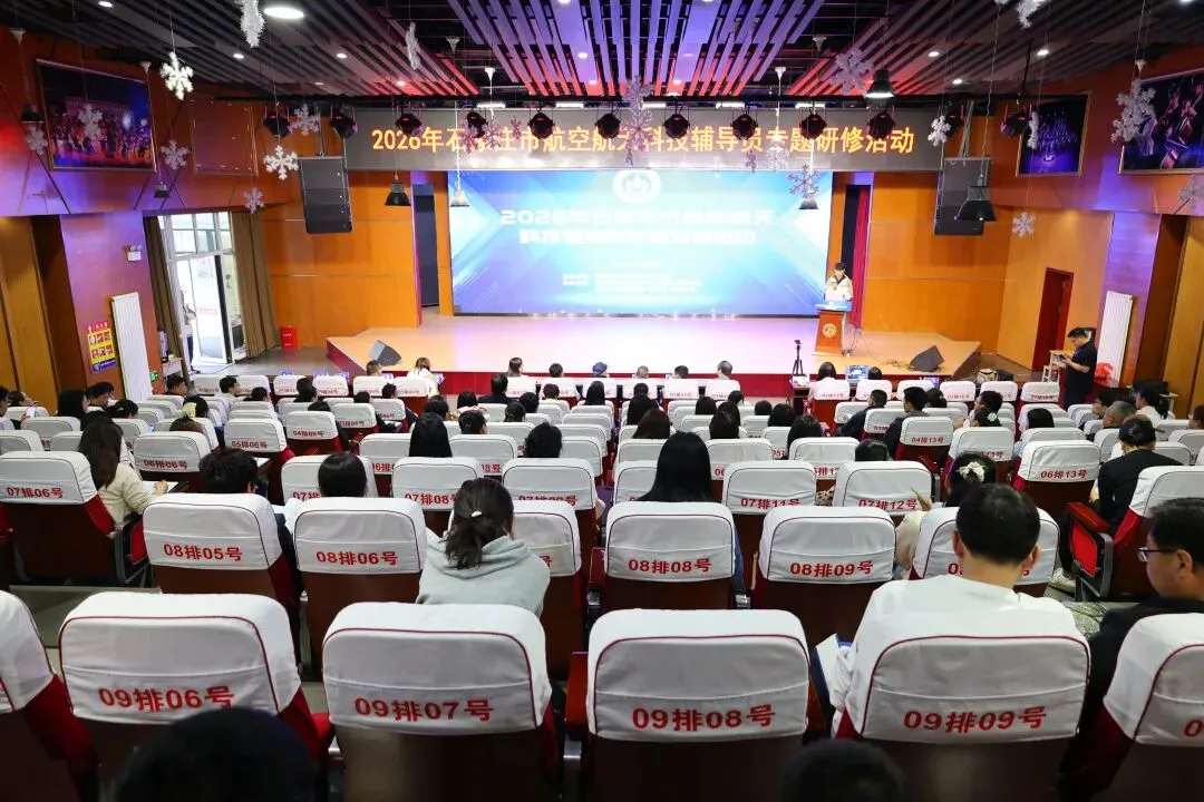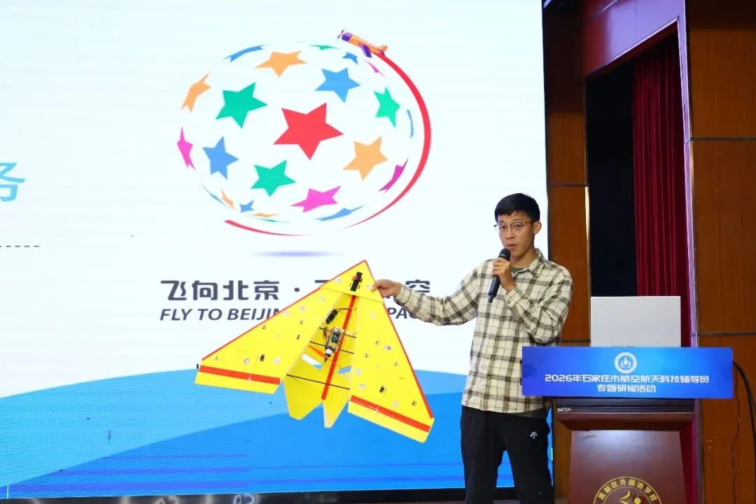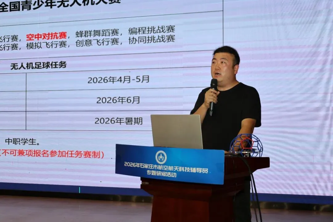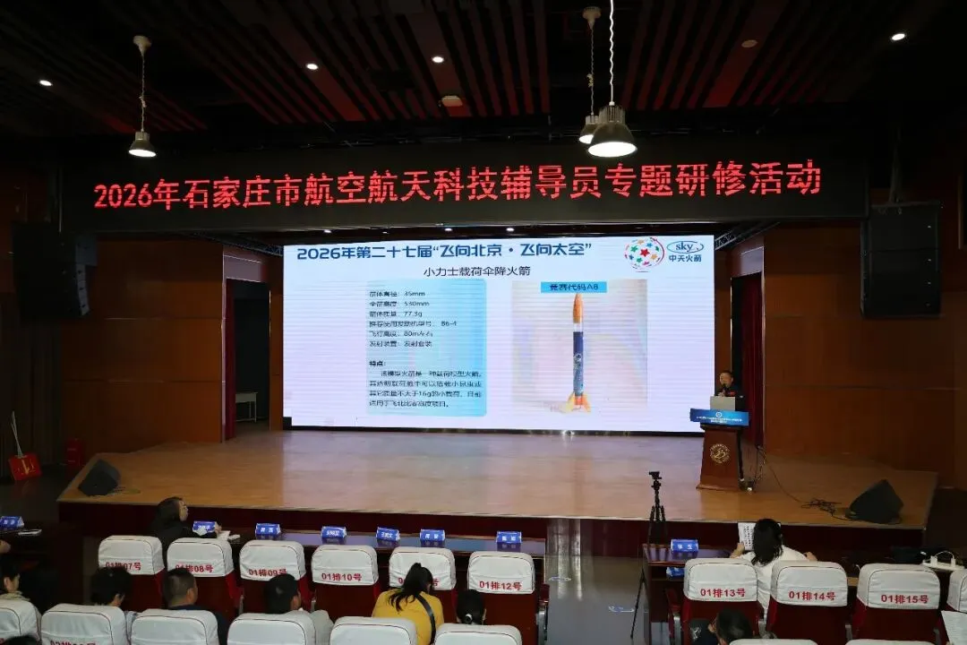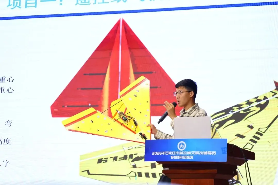 开班仪式上,石家庄高新技术产业开发区外国语学校执行校长高翠平欢迎辞,她说道,作为本次活动的承办单位,学校深感荣幸,将全力做好各项服务保障工作,为活动顺利开展保驾护航。随后,石家庄市科技创新教育学会副秘书长刘凯平致辞,她指出,本次培训是提升科技教师专业能力、为全市科技教育工作者搭建学习、交流、提升的平台,扎实推进赛事筹备工作的关键举措,鼓励全体参训教师珍惜学习机会,认真听讲、积极实践、深入交流,把所学知识转化为教学能力,把实践经验融入日常指导,以更专业的素养、更扎实的本领,引领青少年走近航空航天、热爱科学探索、勇于创新实践。专题讲座环节,石家庄市科技创新教育学会副秘书长刘凯平,围绕第二十七届“飞向北京·飞向太空”全国青少年航空航天模型教育竞赛活动进行整体介绍与赛项规则全面解读,清晰说明了赛事背景、赛项设置、赛程安排及备赛要点。
