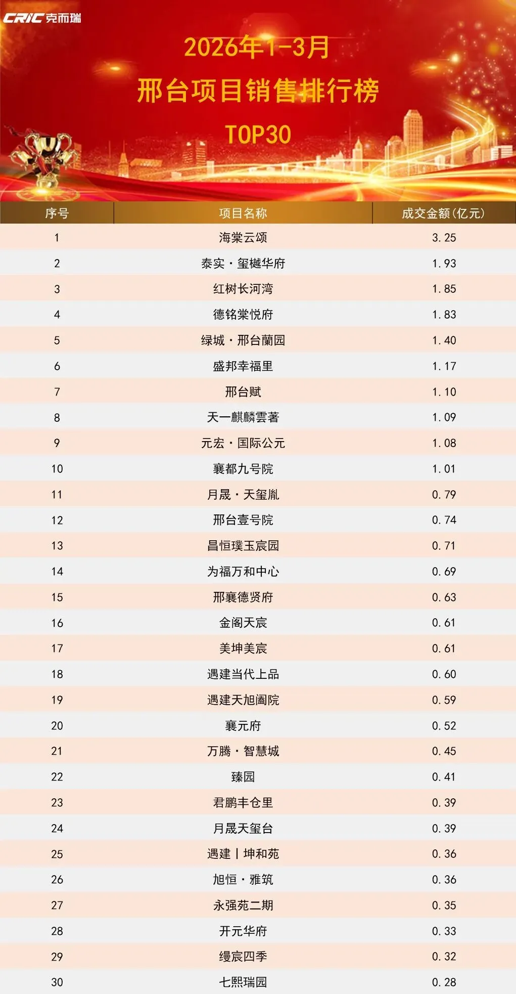 据克而瑞环京投资决策系统统计,2026年1-3月,邢台新增供应11.39万㎡,同比增加12.88%,成交面积40.9万㎡,同比增加6.26%,实现成交金额34.23亿元,同比上升11.72%,成交均价8368元/㎡,同比上升5.13%。
