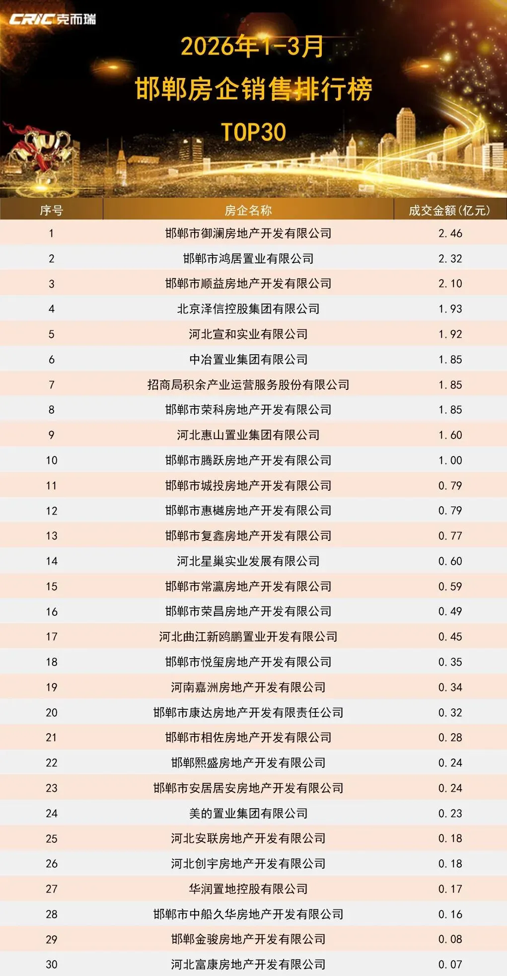 其中,邯郸市御澜房地产开发有限公司以2.46亿元的销售金额排在首位,获得区域内榜单第一;邯郸市鸿居置业有限公司以2.32亿元的销售金额排名第二;邯郸市顺益房地产开发有限公司以2.10亿元的销售金额排名第三。TOP10榜单门槛锁定在1.00亿元。