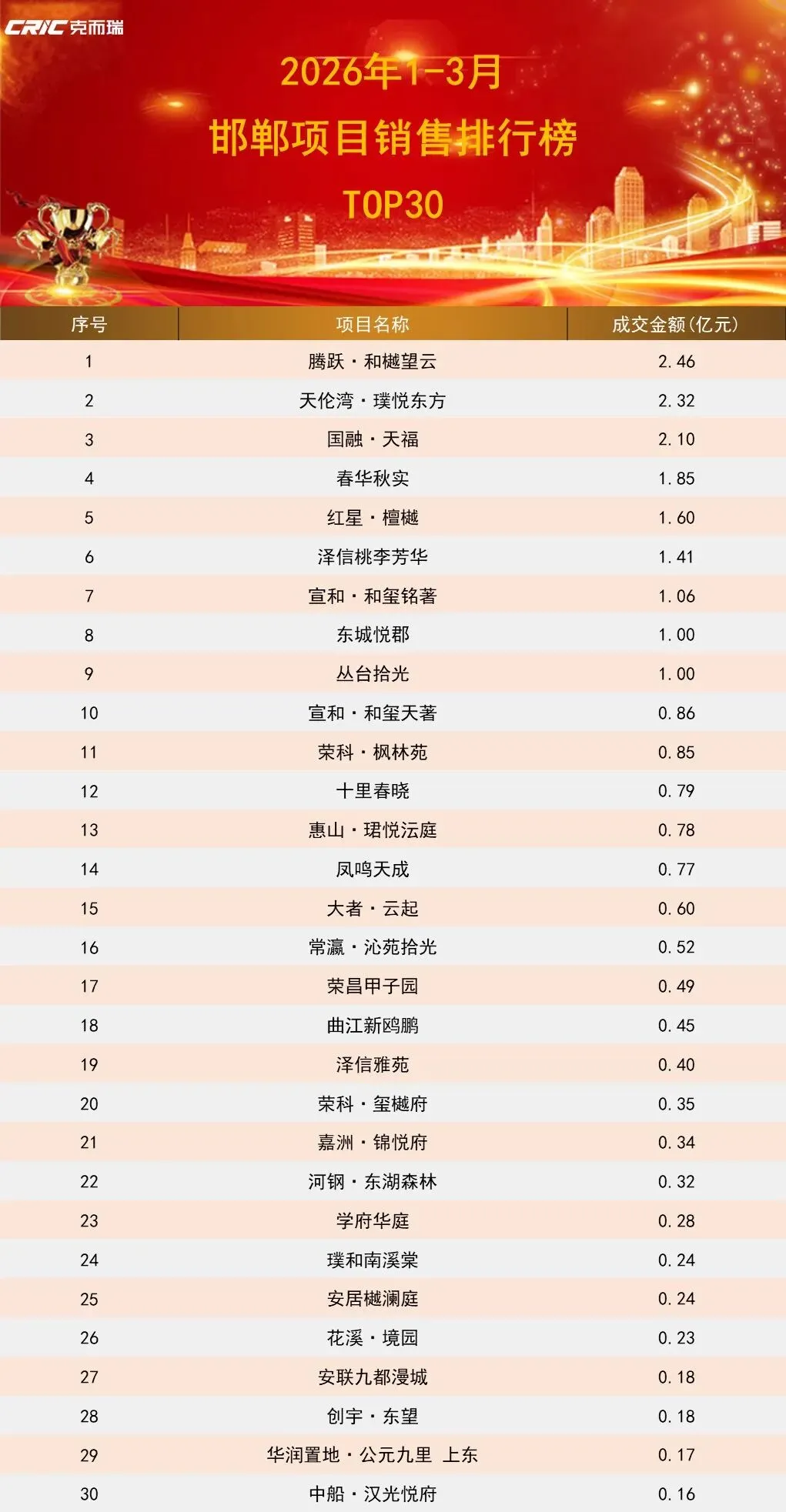 据克而瑞环京投资决策系统显示,2026年1-3月,石家庄新增供应45.7万㎡,同比下降36.9%,成交面积58.2万㎡,同比下降14.1%,成交金额91.4亿元,同比下降17.2%;区域内30强房企实现销售金额共计66.54亿元,约占整体成交额的73%。