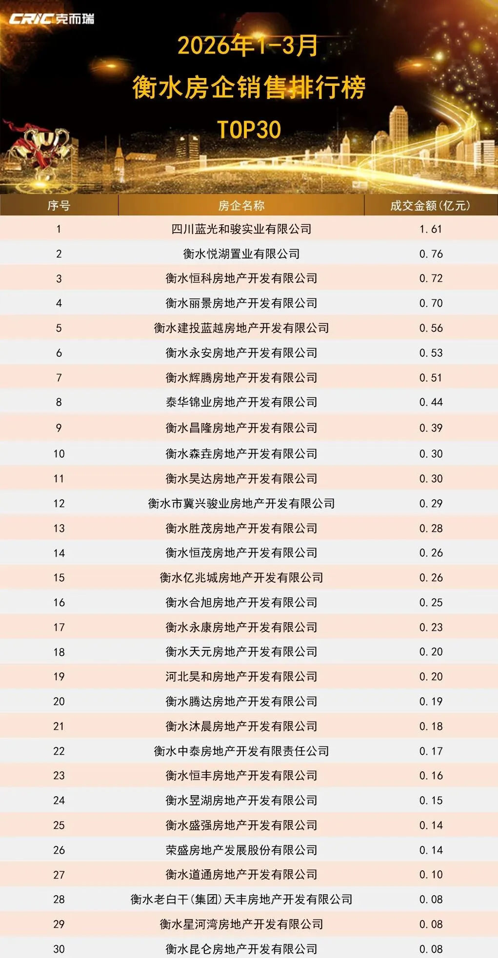 其中,四川蓝光和骏实业有限公司以1.61亿元的销售金额排在首位,获得区域内榜单第一;衡水悦湖置业有限公司以0.76亿元的销售金额排在第二位;衡水恒科房地产开发有限公司则是以0.72亿元的销售金额排名第三。TOP10榜单门槛锁定在0.30亿元。