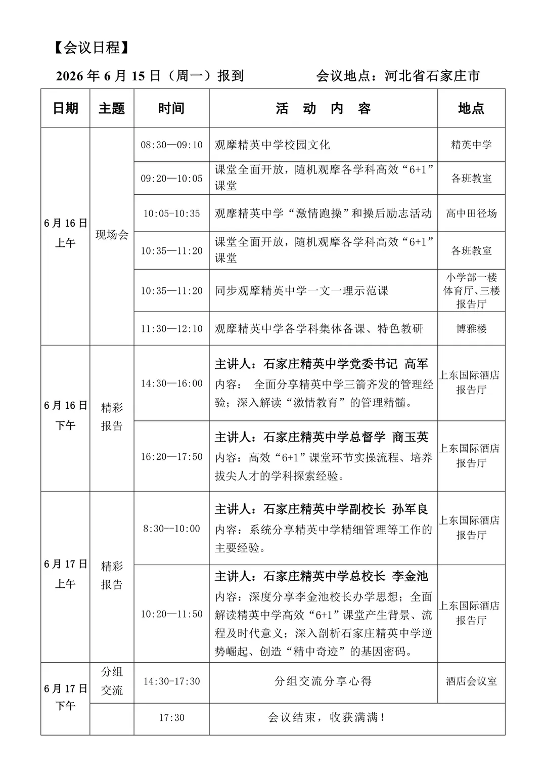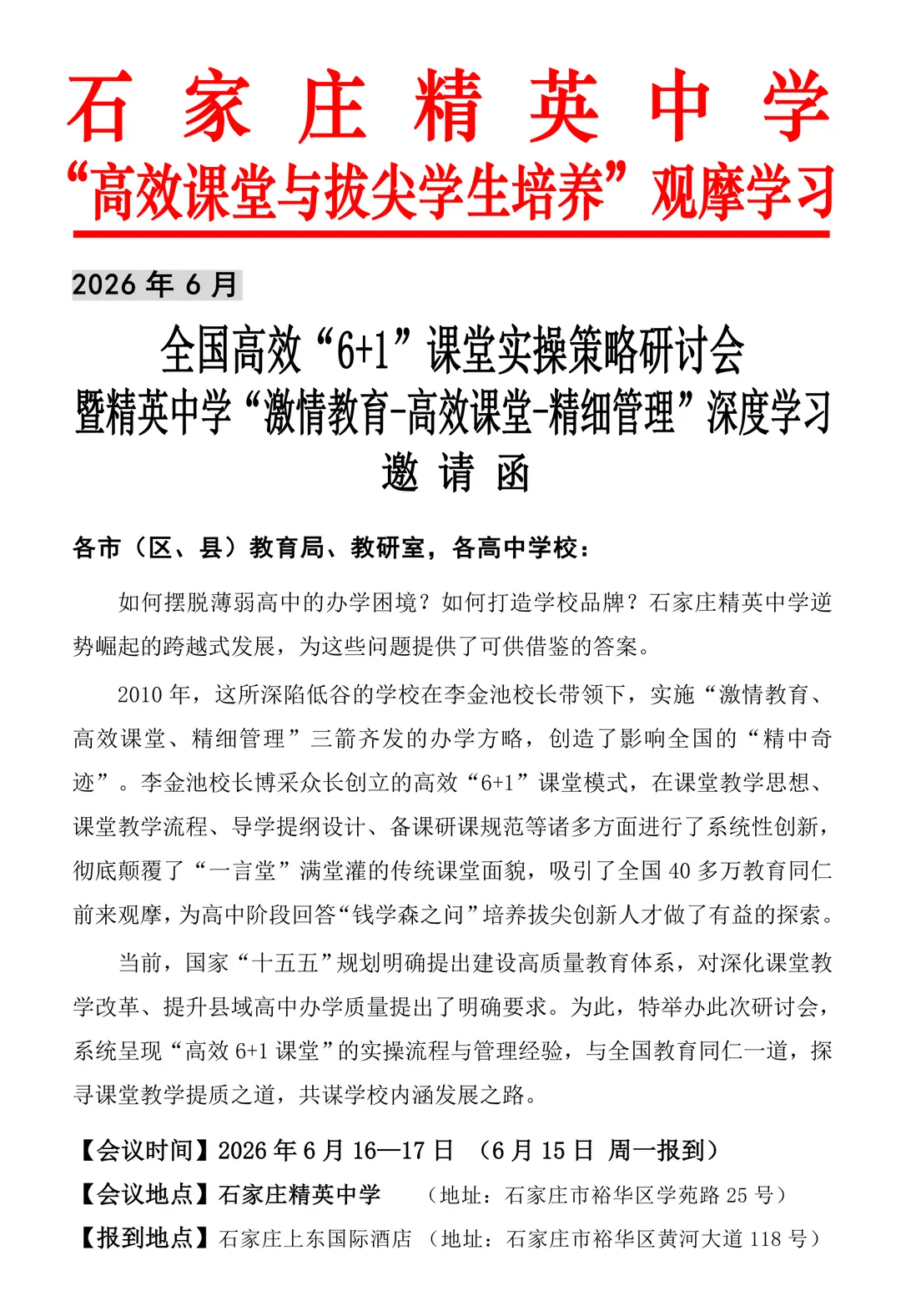 【6月16-17日】石家庄精英中学高效“6+1”课堂实操策略研讨会