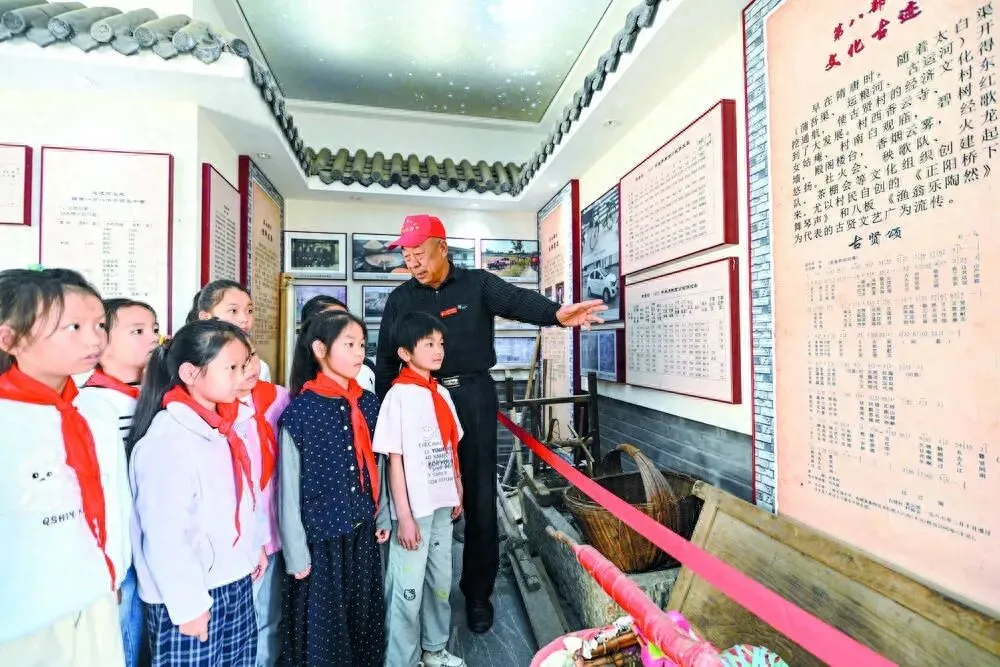 图为在石家庄市鹿泉区古贤村村史馆,小学生了解古贤村历史文化。