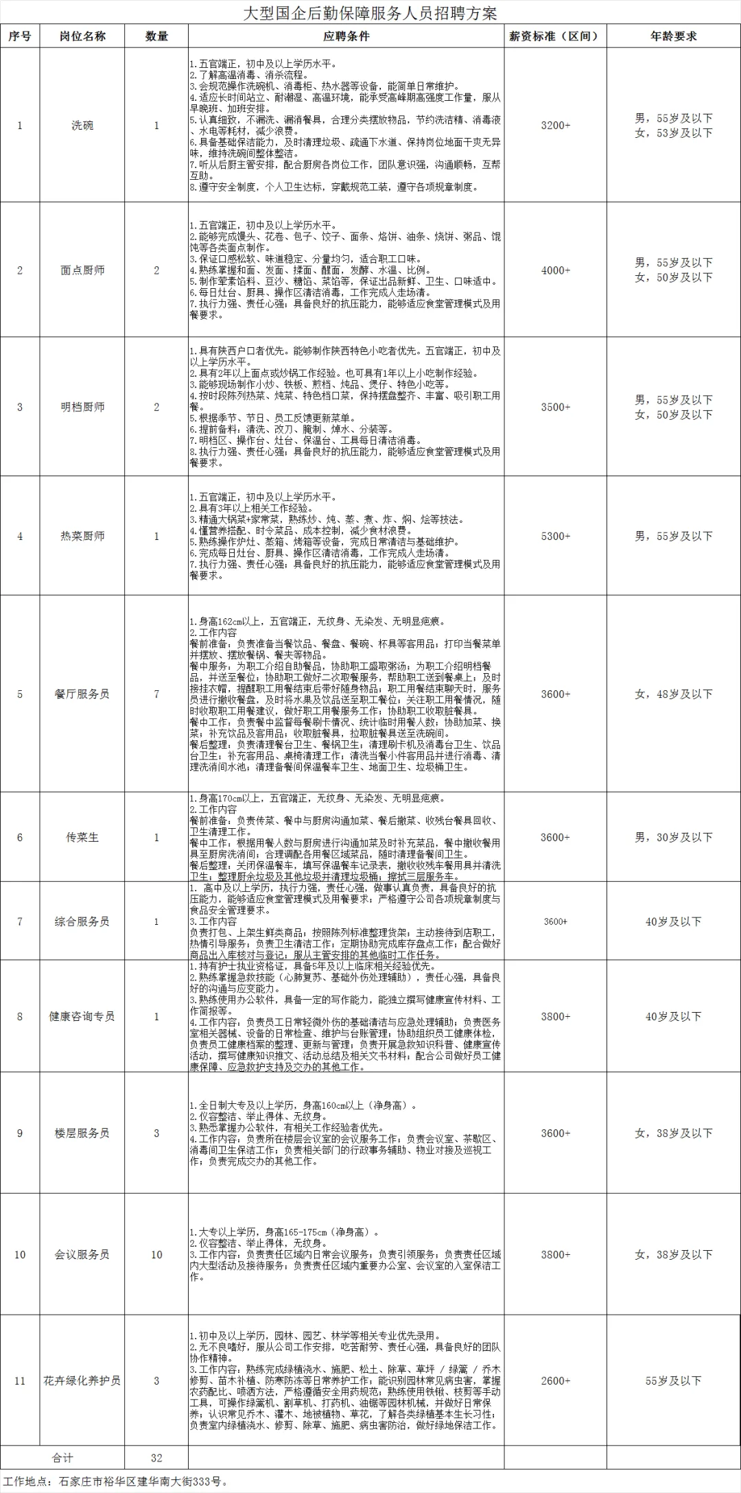 本次招聘拟设10个岗位,共计招聘32人,具体岗位及要求详见附件《大型国企后勤保障服务人员招聘岗位计划表》