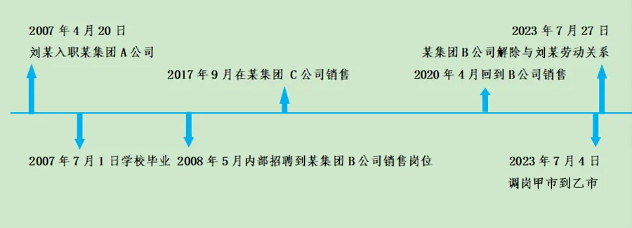 刘某先后在某集团多家关联企业工作,各次解除劳动关系时原用人单位均未支付经济补偿。仲裁及法院依据《最高人民法院关于审理劳动争议案件适用法律问题的解释(一)》第46条,将刘某自2007年7月1日起在A、B、C公司的全部工作年限合并计算为16.5年,据此计算赔偿金基数。这一规则有效防止了用人单位利用关联企业交替签订劳动合同规避工龄责任。