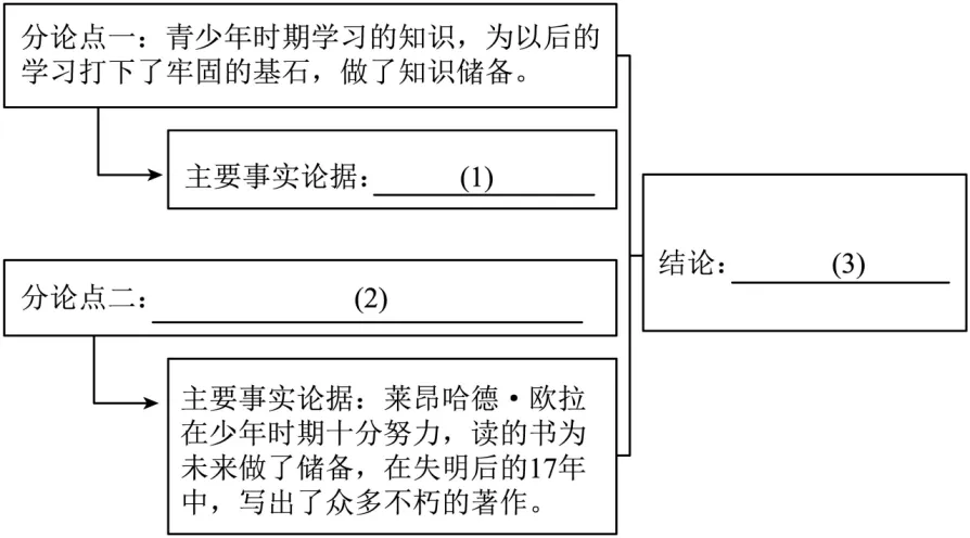 第二空,结合“主要事实论据:莱昂哈德·欧拉在少年时期非常努力,读的书为未来储备,在失明后的17年中,写出了众多不朽的著作”,找到第⑥段可知,在作者看来,人要抓住青少年安稳无忧的学习环境下努力学习,这样可以为未来储备,可以抵御成年后的坎坷、干扰等。据此可拟写,青少年时期努力学习,可为未来储备,抵御成年后的坎坷干扰。