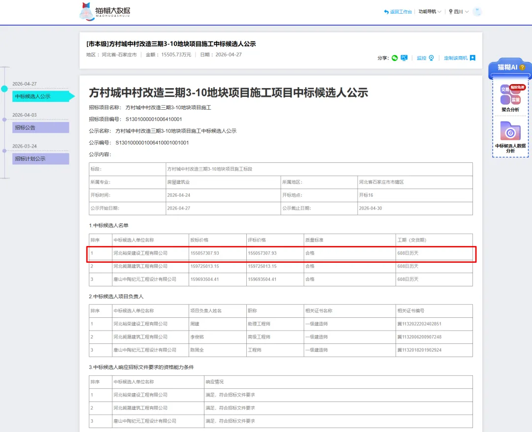 该项目于4月24日正式开标,共有9家投标人参与投标,投标最高限价为1.5985亿元。最终由河北裕荣建设工程有限公司以1.5505亿元成功中标。项目计划工期为608个日历天。