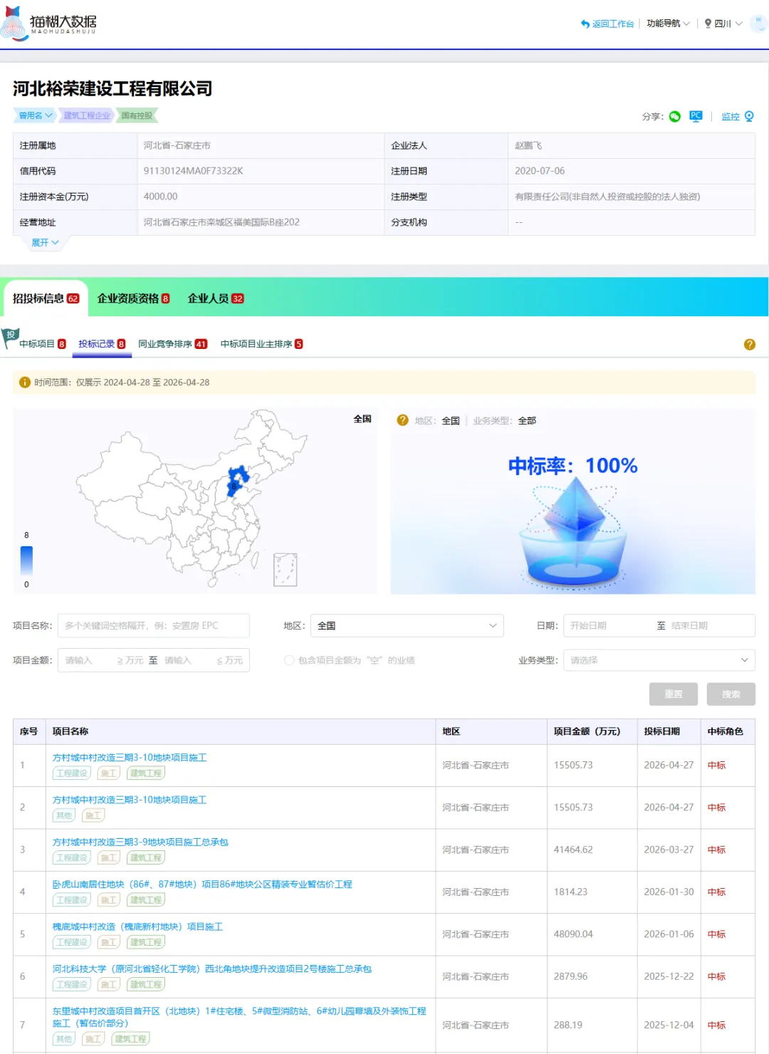 如果您想了解该中标人的招投标经营状况,可以通过猫糊平台的“企业查询”来查看该企业在过去两年内全国各地的投标记录。