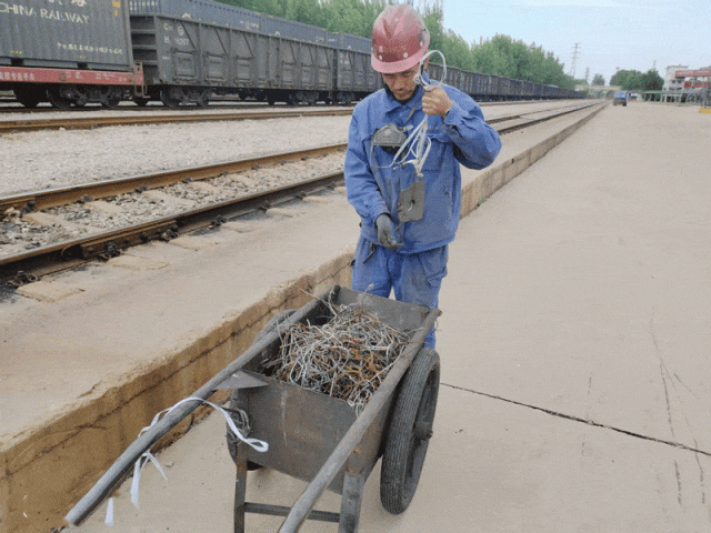 邢台营业部强化货场金属废弃物整治,使用自制“磁吸式铁类物品捡拾器”,重点清理货场道心和两侧的废铁钉、铁丝,高效清除安全隐患。(邢台营业部供稿)