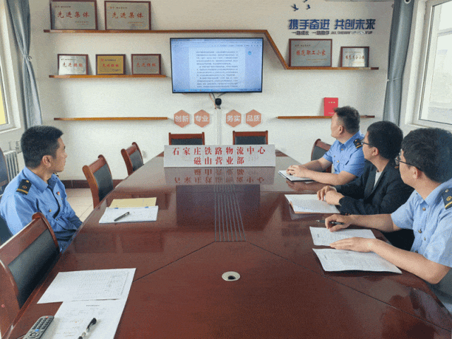 邯郸营业部联合邯郸站、邯郸国际陆港有限公司,共同研讨优化取送车及场内作业效率的举措,在充分满足客户需求的基础上,最大限度释放车站运能。(邯郸营业部供稿)