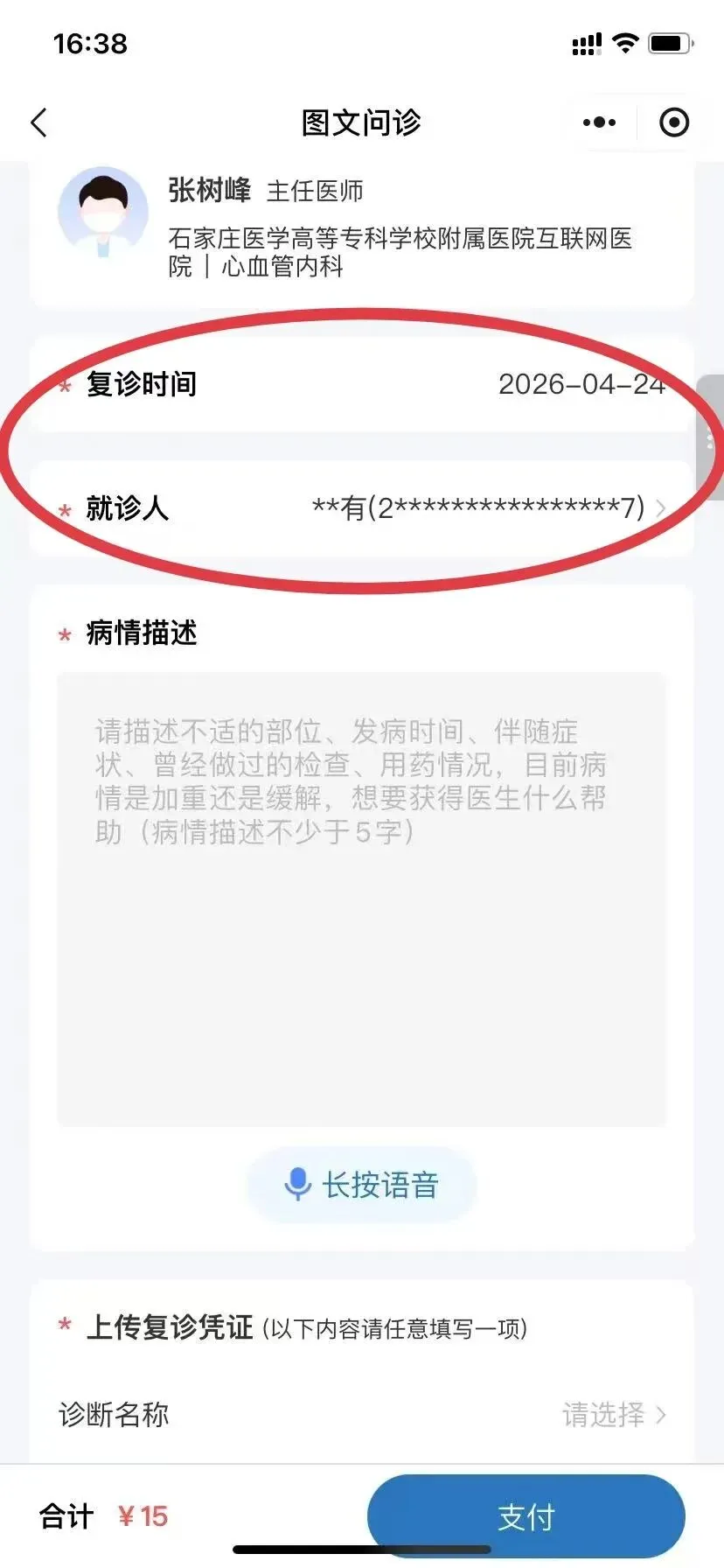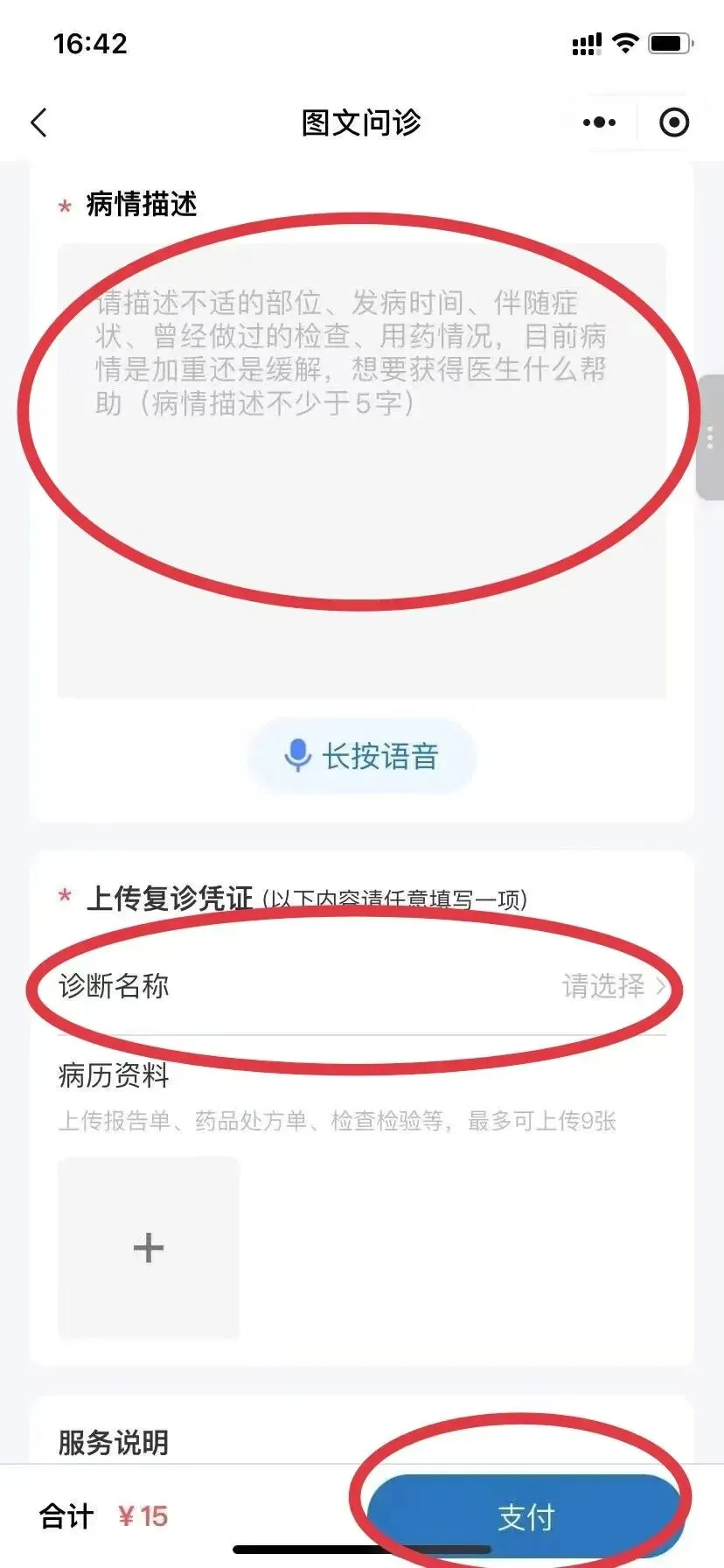 5、详细填写病情描述并上传复诊凭证(支持选择诊断名称或上传病历资料)切记支付