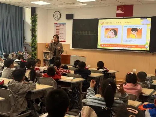 一年级(1)班两位家长分别化身“小记者”与“急救小导师”,《我是小记者》课程讲解新闻常识与六要素,指导采访礼仪与表达技巧,通过现场模拟互动提升孩子语言表达与沟通能力;《生活急救小课堂》围绕流鼻血、崴脚、卡鱼刺等常见问题教授科学处理方法,讲解七步洗手法与健康生活习惯,强化学生安全自护意识。