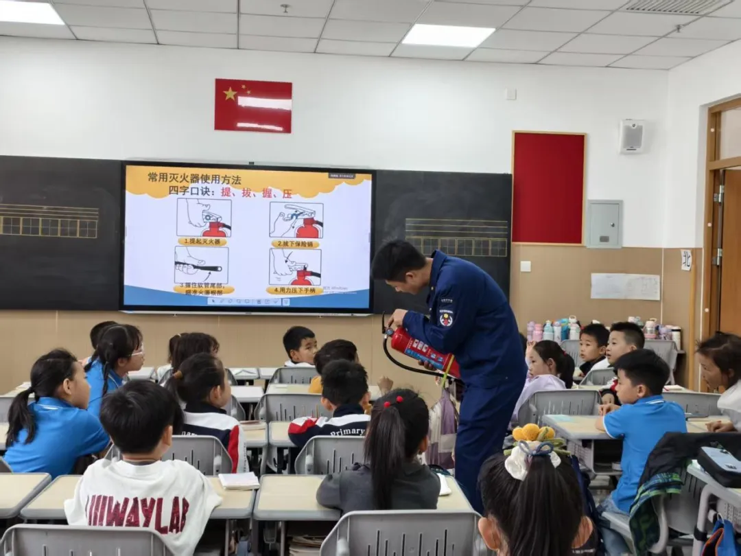 一年级1班王梓安爸爸带来民航消防知识课,细致讲解机场消防职责、119报警方法、消防器材使用与火场逃生技巧,以趣味互动为孩子筑牢安全意识。