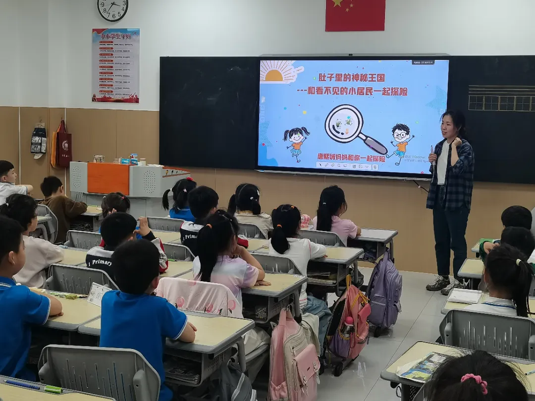 一年级(3)班唐熙城妈妈带来《肚子里的神秘王国》人体科普课,带领孩子认识微生物、守护自身健康;李墨荀妈妈开启环球人文课,助力孩子拓宽国际视野。