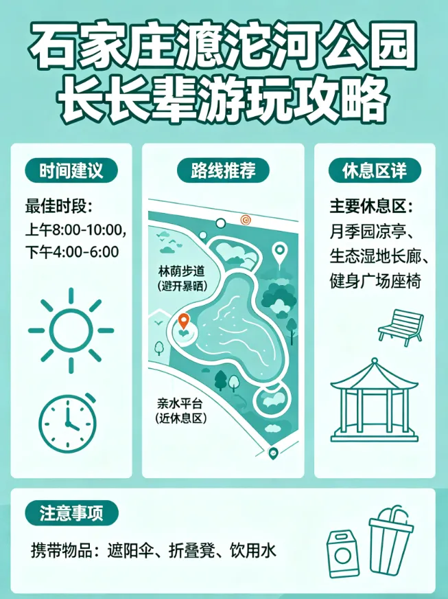 去滹沱河公园,时间选对很重要。建议长辈们避开正午的烈日,早上七点到十点,或者下午四点之后前往,此时阳光柔和,气温也更舒适,走在公园里,既不会晒得头晕,又能尽情欣赏河畔风光。