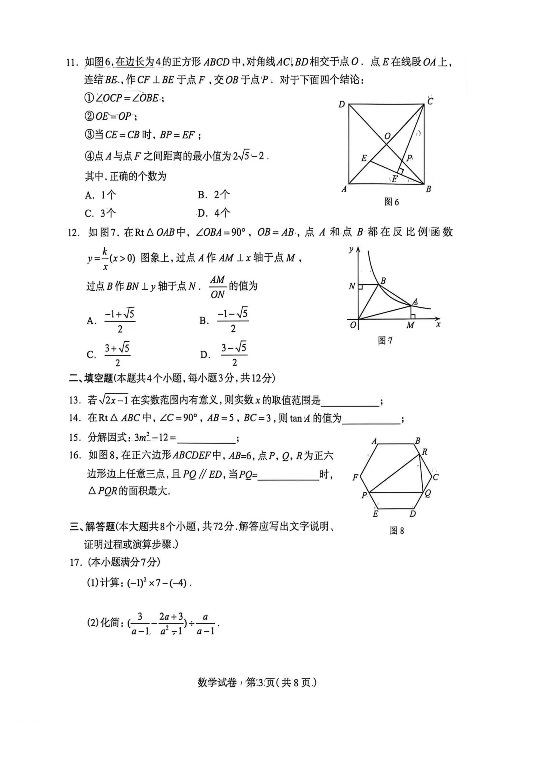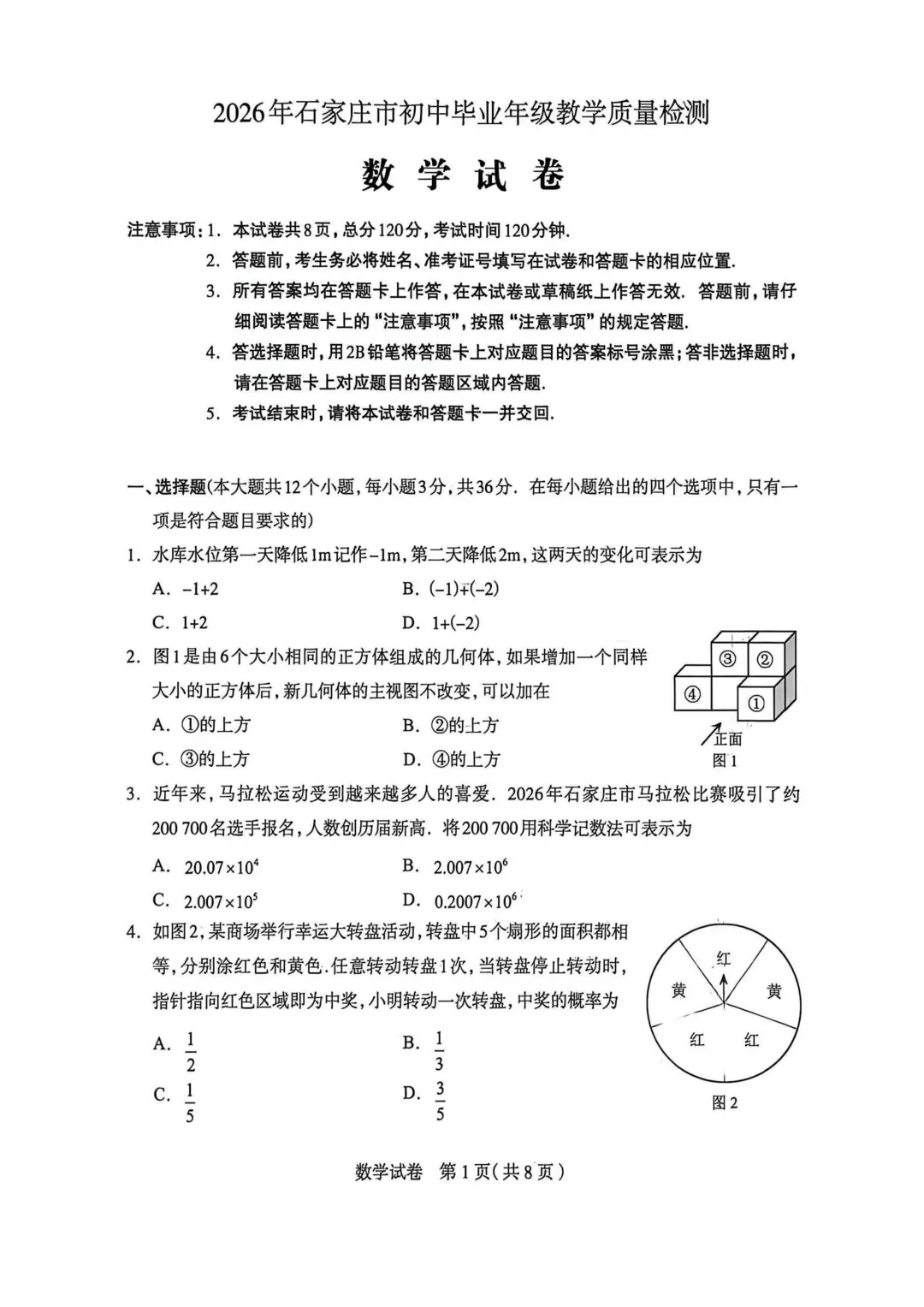 石家庄市2026年中考一模数学试题及参考答案