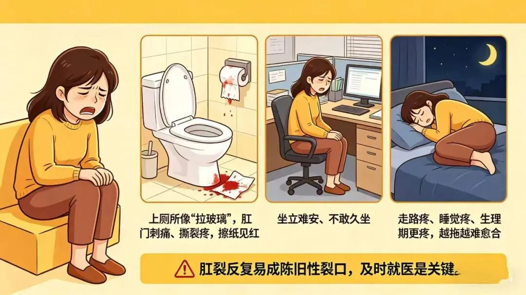很多女生都有难言之隐:上厕所像“拉玻璃”,肛门刺痛、撕裂疼,擦纸就见红,坐立难安、不敢久坐,还不好意思去看医生。肛裂一旦反复,走路疼、睡觉疼、生理期更疼,越拖越难愈合,最后变成陈旧性裂口,反反复复折磨人。