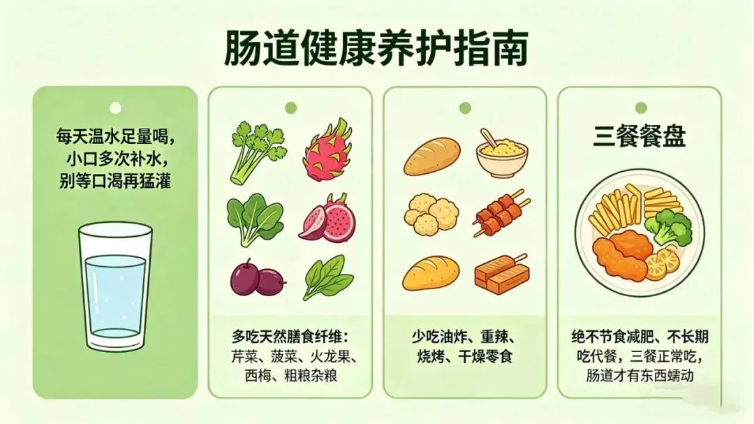 每天温水足量喝,小口多次补水,别等口渴再猛灌;多吃天然膳食纤维,芹菜、菠菜、火龙果、西梅、粗粮杂粮,少吃油炸、重辣、烧烤、干燥零食;绝不节食减肥、不长期吃代餐,三餐正常吃,肠道才有东西蠕动。