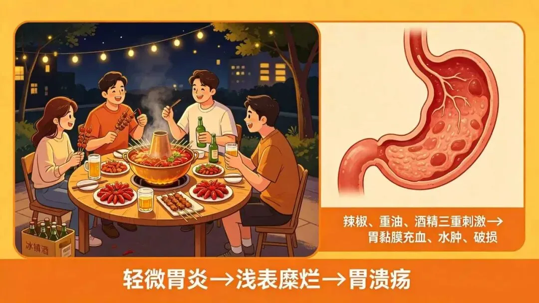 辣椒、重油、酒精,三重刺激叠加,胃黏膜充血、水肿、破损。