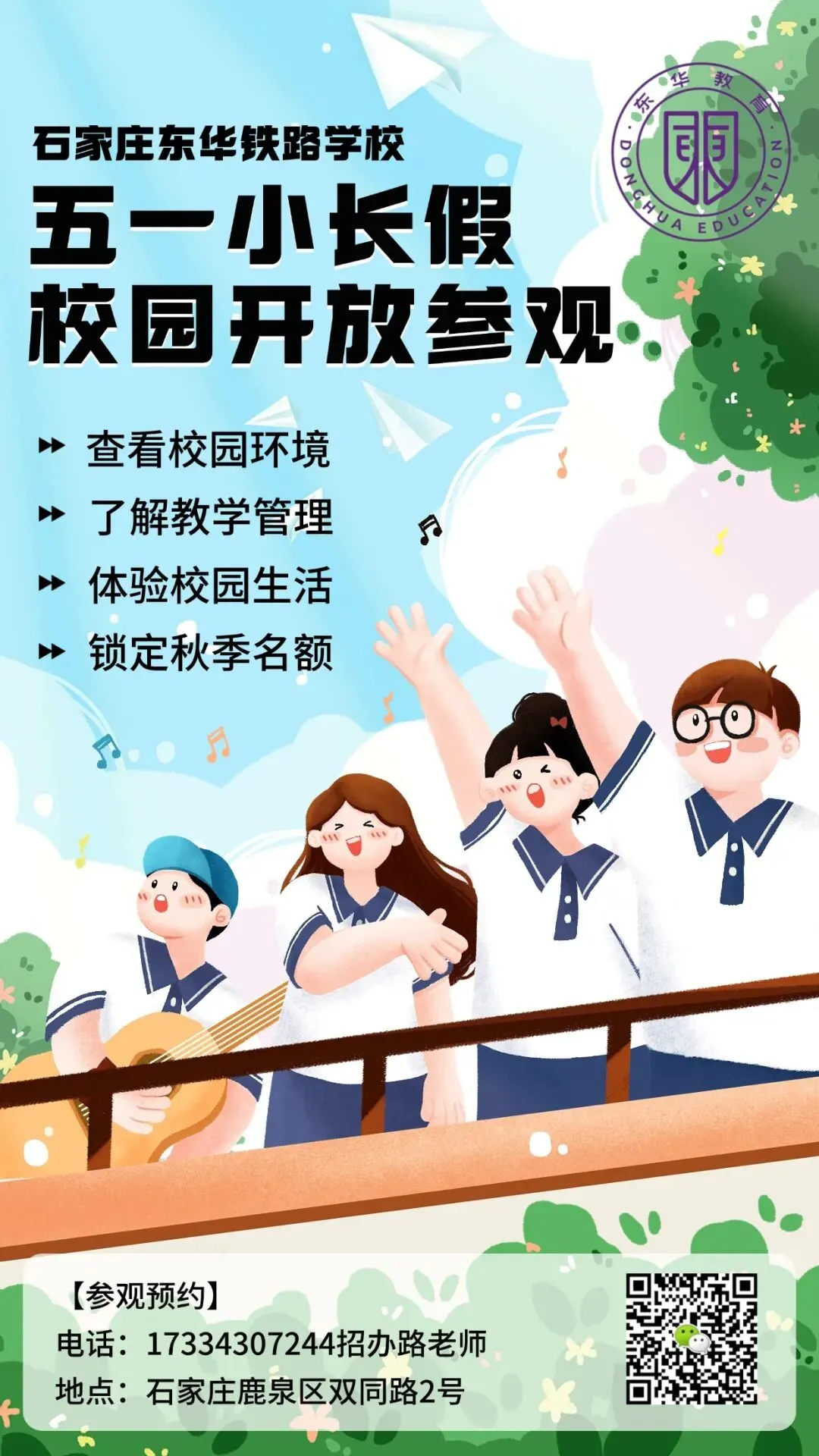 五一小长假,欢迎来东华铁路学校!全体招办老师为您提供一对一校园参观、专业详细讲解,全天提供接待服务。