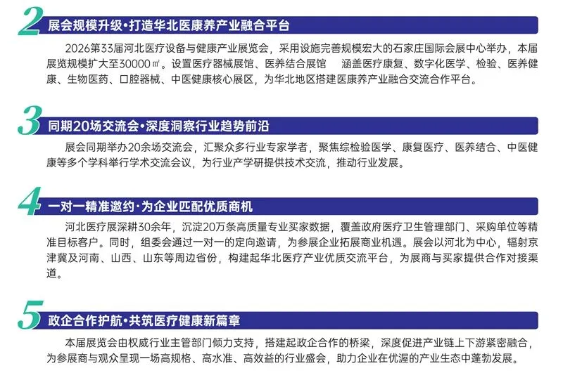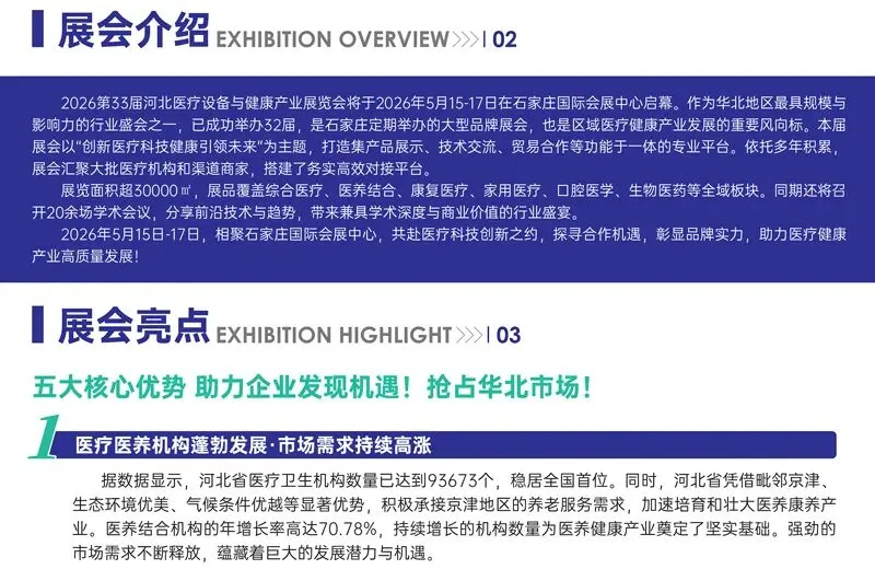 2026第33届河北医疗设备与健康产业展览会将于2026年5月15-17日在石家庄国际会展中心启幕。作为华北地区最具规模与影响力的行业盛会之一,已成功举办32届,是石家庄定期举办的大型品牌展会,也是区域医疗健康产业发展的重要风向标。