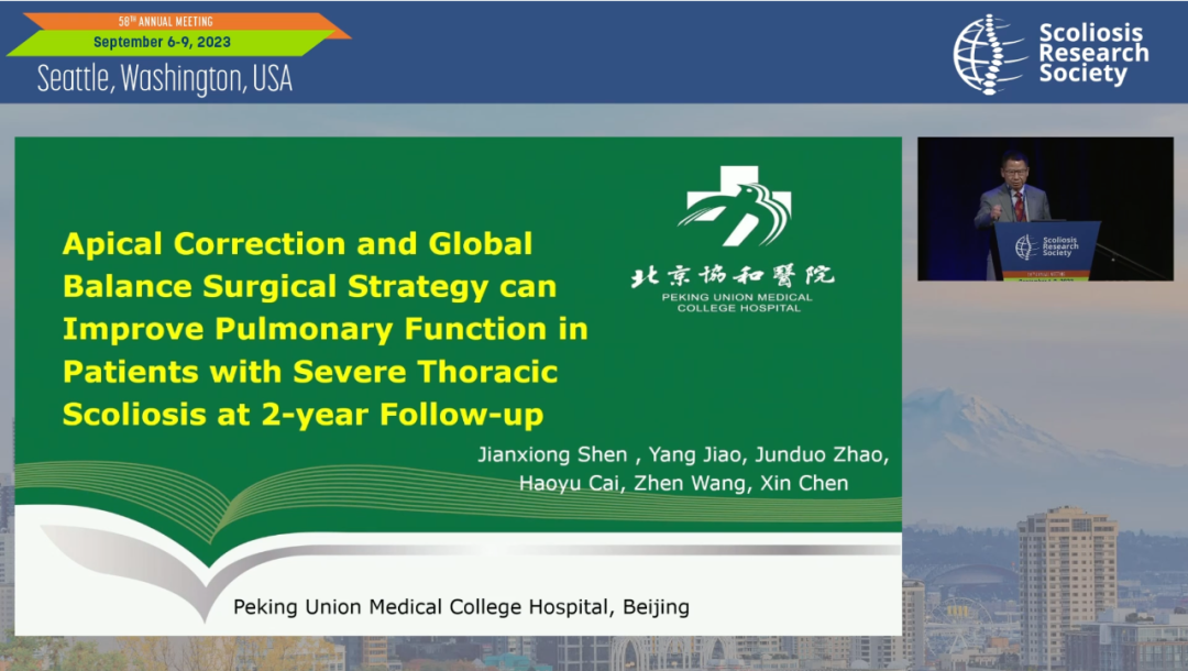 沈建雄教授报告了36例胸弯超过90°的重度脊柱侧凸患者的前瞻性队列研究,结果提示“局部矫形、整体平衡”的手术策略对于严重脊柱畸形安全、有效,而且可以改善患者的肺功能;术后2年患者复查的肺功能较术前明显改善;术后胸廓高度的改善、胸廓容积的增加是肺功能改善的重要因素之一。“局部矫形、整体平衡”策略在畸形最重的顶椎区使用短棒进行局部矫形,无需牵引或前路松解,仅需使用低级别截骨(Schwab I-II级),可有效避免高级别截骨带来的并发症。该手术策略的协和治疗经验已在BMC Musculoskeletal Disorders等杂志上发表,在国内外得到认可和应用。