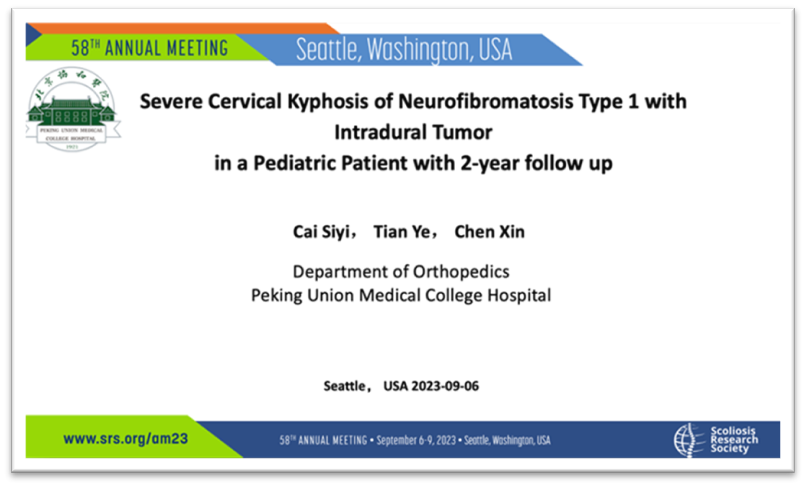 蔡思逸副教授进行了“Severe Cervical Kyphosis of Neurofibromatosis Type 1 with Intradural Tumor in a Pediatric Patient with 2-year Follow-up”的报告。通过对I型神经纤维瘤病伴硬膜内肿瘤,同时合并严重颈椎后凸畸形的少见病例的介绍,展示其手术治疗策略及随访结果,阐述了对于该类严重疾病中国医师的治疗经验和思考,其良好的治疗效果值得肯定,建议对类似的严重颈椎后凸患者可进行术前牵引,根据预矫形效果在术中脊髓电生理监护下进行前、后路联合手术,并一期切除硬膜内肿瘤。该病例引起国际专家热烈讨论并获得了认可。