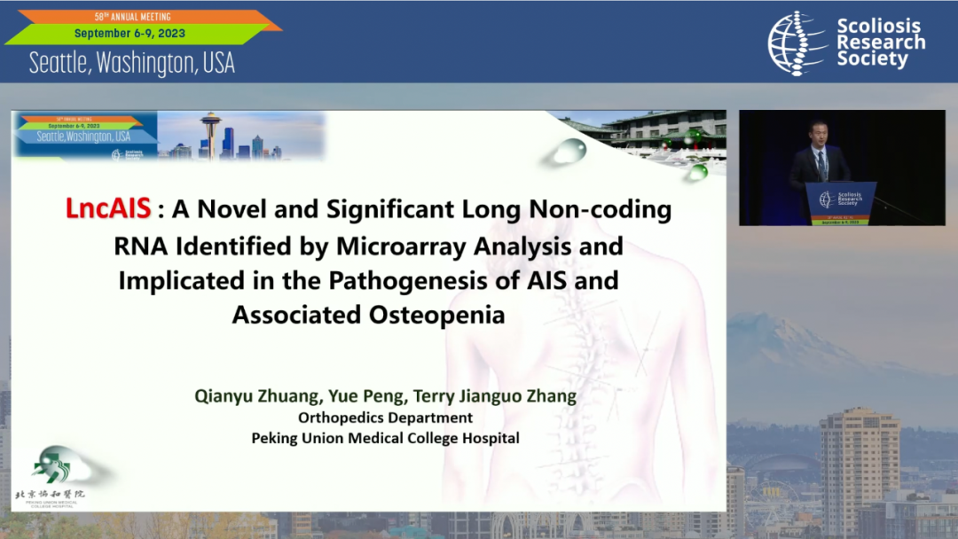 庄乾宇教授报告了协和骨科对于长链非编码RNA“LncAIS”在AIS发病机制中的探索研究。在仉建国教授带领下,团队全面解析了lncAIS、NF90和转录因子HOXD8共同调节的分子机制,揭示了lncAIS在调控BM-MSCs成骨分化中的关键作用。另外,在E-point presentations会场, 庄乾宇教授介绍了仉建国教授团队在AIS BM-MSCs单细胞转录组方面的最新工作。此外,庄乾宇教授作为今年的SRS Traveling Fellow, 在年度Business meeting上,向SRS主席团及全体委员报告了在全美6个城市(Chapel Hill、Minneapolis、San Diego等)、10余家顶尖脊柱侧凸中心的巡回访问交流情况。