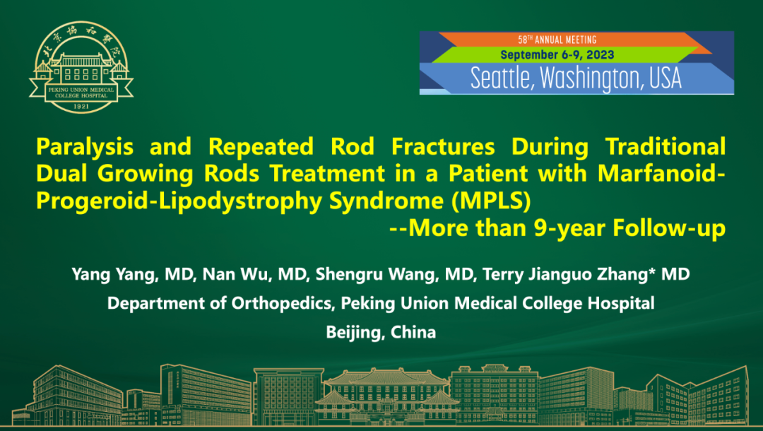 杨阳主治医师报告题目为:“Paralysis and Repeated Rod Fractures During Traditional Dual Growing Rods Treatment in a Patient With Marfanoid-Progeroid-Lipodystrophy Syndrome: More than 9-year Follow-up”。研究介绍了一例合并MPLS(马凡样-早衰样-脂质营养不良综合症)的早发性脊柱侧凸患者长达9年的随访结果,指出基因测序分析在罕见的综合征性早发性脊柱侧凸患者的诊断、治疗中的重要作用,应用传统双生长棒技术治疗此类患者可以取得满意的效果,治疗过程中关注内固定相关并发症和风险,合理正确的处置可以保证患者长期疗效和满意效果。