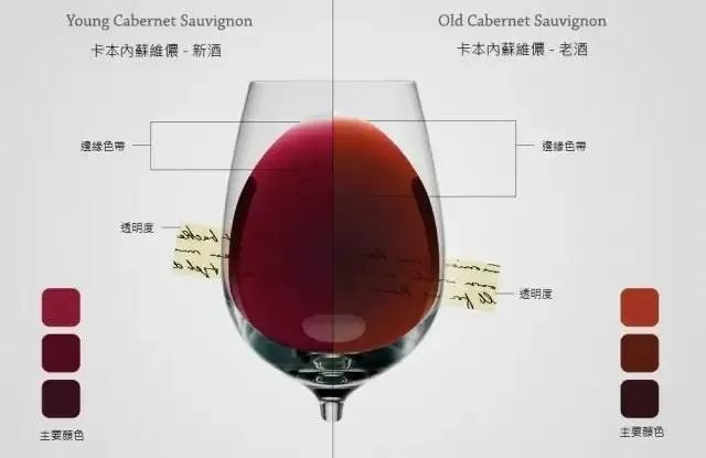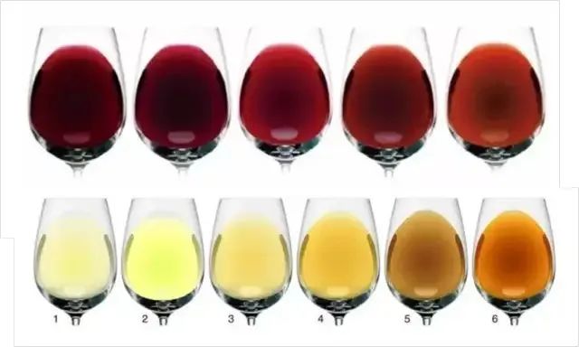葡萄酒的颜色来自于葡萄果皮。同品种的葡萄,因为产地、酿造工艺和陈年的不同,呈现出来的颜色也是有区别的。
