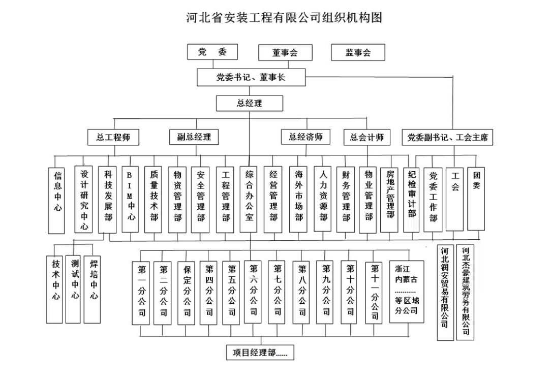 河北省安装工程有限公司成立于1958年,是河北省国有大型建筑安装施工企业。目前,公司在册职工2660人,其中管理人员1660人,工人1000人。现有正高级职称62人,副高级职称228人,中级职称357人。拥有一级建造师250人,二级建造师397人,一级造价师38人。