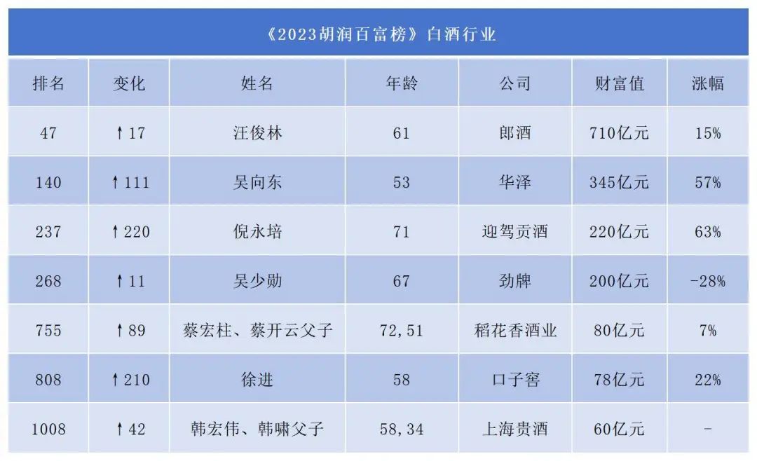而在《2023胡润百富榜》上,白酒行业有7位企业家上榜,与去年持平,排名均有不同程度的提升,有一人跻身总榜单TOP50。财富总额为1693亿元,同比增长16.9%。