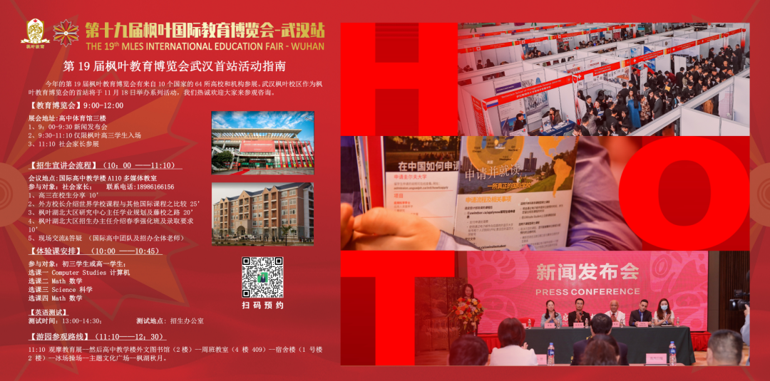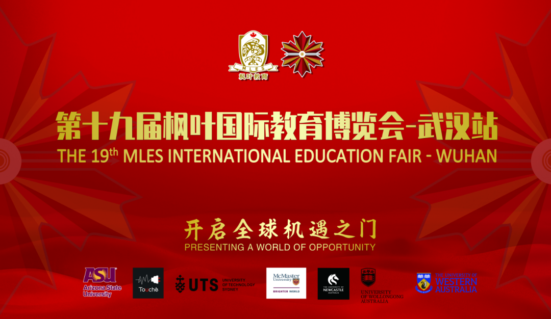 第十九届枫叶教育博览会(武汉首站)将于11月18日(周六)上午 9:30召开,届时将会有来自来自美、英、加、新、日本等热门留学目的地的11个国家及地区,63所海外高校和国内合作院校参展,参会学生及家长可零距离体验这一场充满机遇、成就梦想的升学规划盛宴!