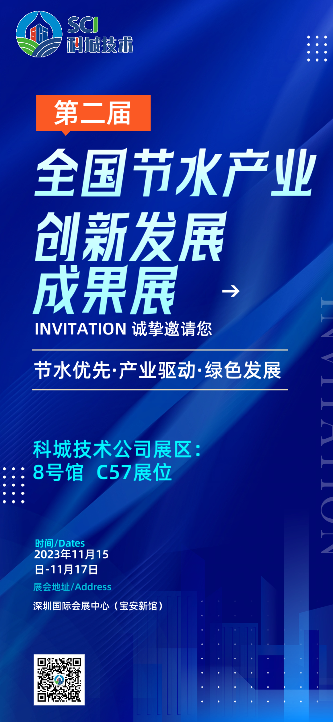 2023年11月15日,第二十五届中国国际高新技术成果交易会第二届全国节水产业创新发展成果展在深圳国际会展中心(宝安新馆)盛大开幕,科城技术公司-8号馆C57展位诚挚邀请您的到来!