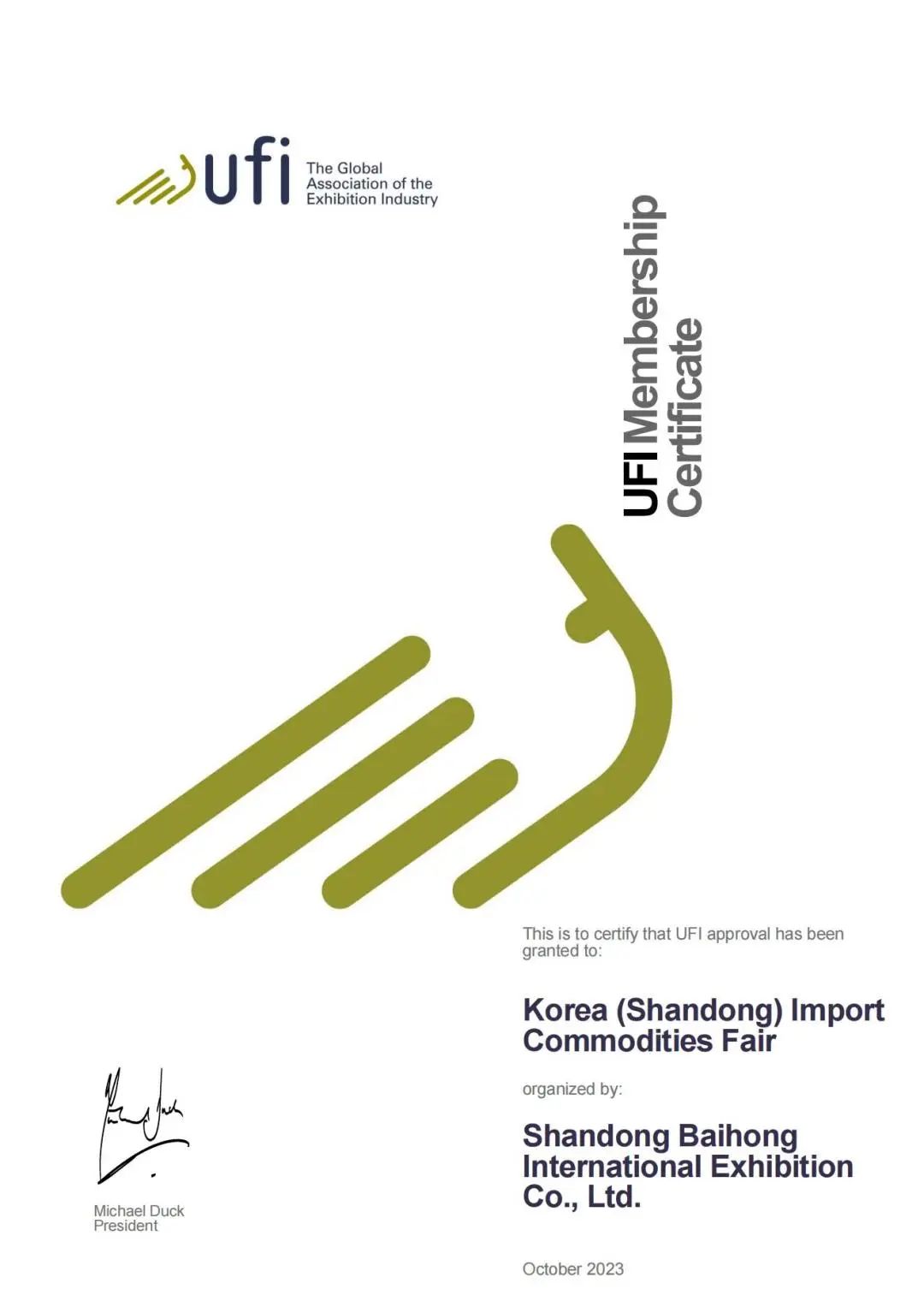 近日,韩国(山东)进口商品博览会(以下简称“博览会”)通过国际展览联盟(UFI)资格认证,正式加入国际性顶尖品牌展会行列。这是继11月7日博览会获得“2023年度中国会展之星·最具创新特色展会”之后的又一殊荣。