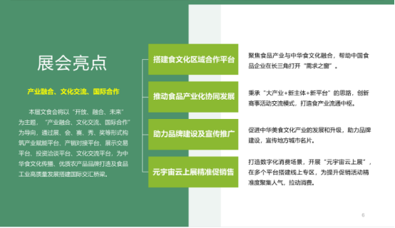 展览展示国外优秀食材和食文化,促进食文化交流合作,食品产业发展融合、食品科技进步等方面的国际研讨交流、国际合作交流和供需市场交流,推进中国食品及食文化随“一带一路”战略的实施走出国门走向世界。