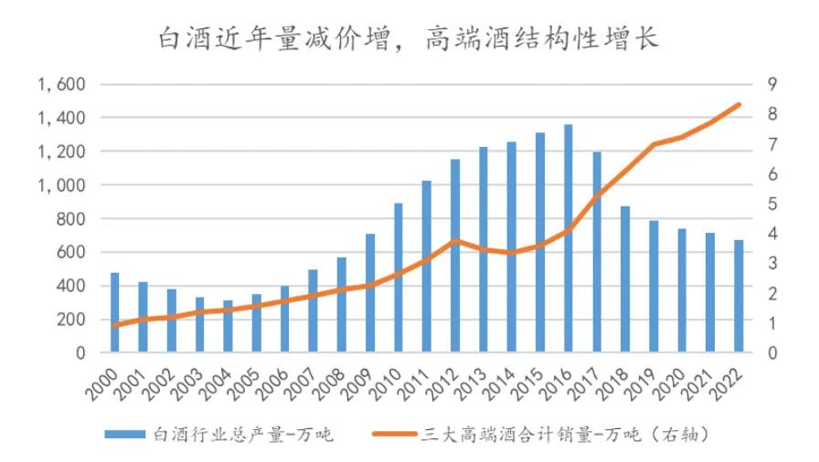 事实上,在中国经济高速发展的20年里,原来的30岁客群正成为当前的高端酒主力消费群体。在白酒整体的产销量下降的阶段,高端酒销量在持续扩张,背后是白酒内在的社交和文化属性,以及好酒供不应求仍然是结构性的发展趋势。