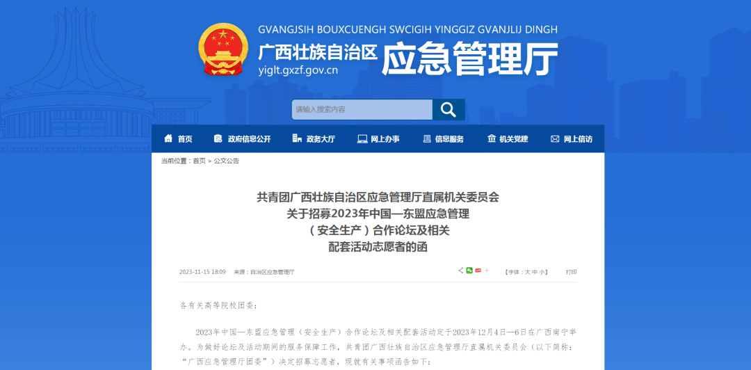 2023年中国—东盟应急管理(安全生产)合作论坛及相关配套活动定于2023年12月4日—6日在广西南宁举办。为做好论坛及活动期间的服务保障工作,共青团广西壮族自治区应急管理厅直属机关委员会(以下简称:“广西应急管理厅团委”)决定招募志愿者,现就有关事项函告如下:
