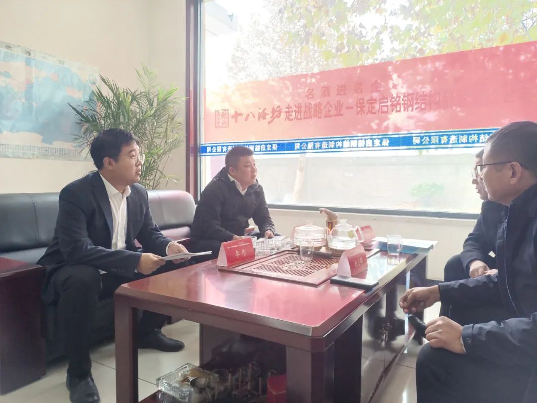 为加强企业间交流,促进相互合作。11月15日,衡水老白干营销有限公司保定大区大客户部经理王鹤,河北醉沧澜餐饮有限公司经理赵志刚、副经理李娇等一行前往保定启铭钢结构制造有限公司参观交流,启铭钢结构有限公司总经理王保柱参加接待。