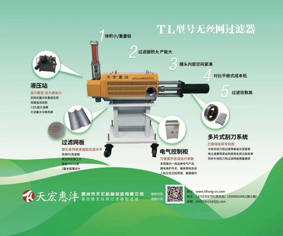 惠州市天宏机械制造有限公司位于广东省惠州市,主营产品为塑料熔体用无丝网过滤器,公司拥有数位无丝网过滤器设计工程师及调试技术人员,熟悉各类塑料再生利用生产设备及生产工艺。公司拥有过滤网板加工车间,机加工车间,组装车间;过滤网板加工车间拥有国内激光机密切割设备数台,可以稳定加工0.15mm微孔,加工速度高于同行业,综合成本远低于同行业平均水平,可以为客户提供性价比高的过滤网板。机加工车间拥有各种数控加工设备,基本实现数字化管理。公司设计总工在无丝网过滤器行业深耕10余年,历经各类平板式无丝网过滤器设计,参与申请各类有关无丝网过滤器国内专利数十件,国际专利数件。