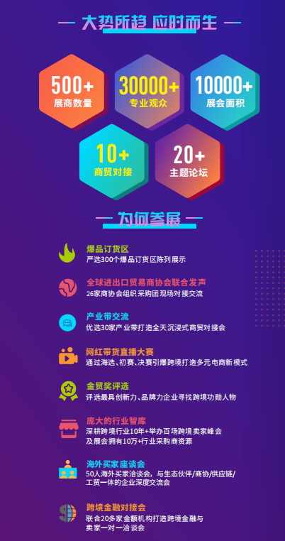 观展企业能够获取最前沿行业信息,接触外贸行业国内外头部客户以及专业买家,获得更具成效的上下游贸易以及投融资金融机构的关注,进一步增强企业核心竞争力;在境内外国家级媒体和专业媒体的宣传下,提升品牌知名度和行业影响力!