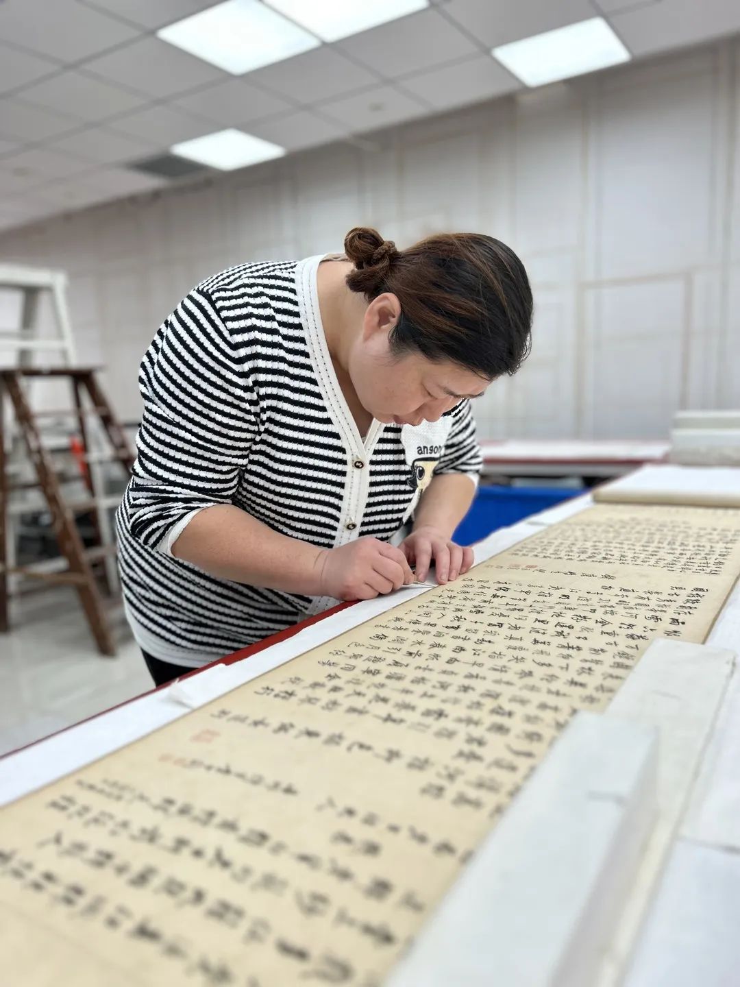 文物的每一次展览,展前都需要修复老师们仔细地检查和修复。书画作品每一次面向大众的展出,不仅需要除尘等保证作品展出效果的工作,更需要排除一切上展前的安全隐患。比如:书画作品经常悬挂,会因为书画的天杆处不利承重而断裂,这时就需要修复师对天杆位置进行加固。手卷文物的包首处经常有磨损痕迹,这些磨损会影响文物展出效果,文物修复师就需要对破损厉害的部分进行修复。