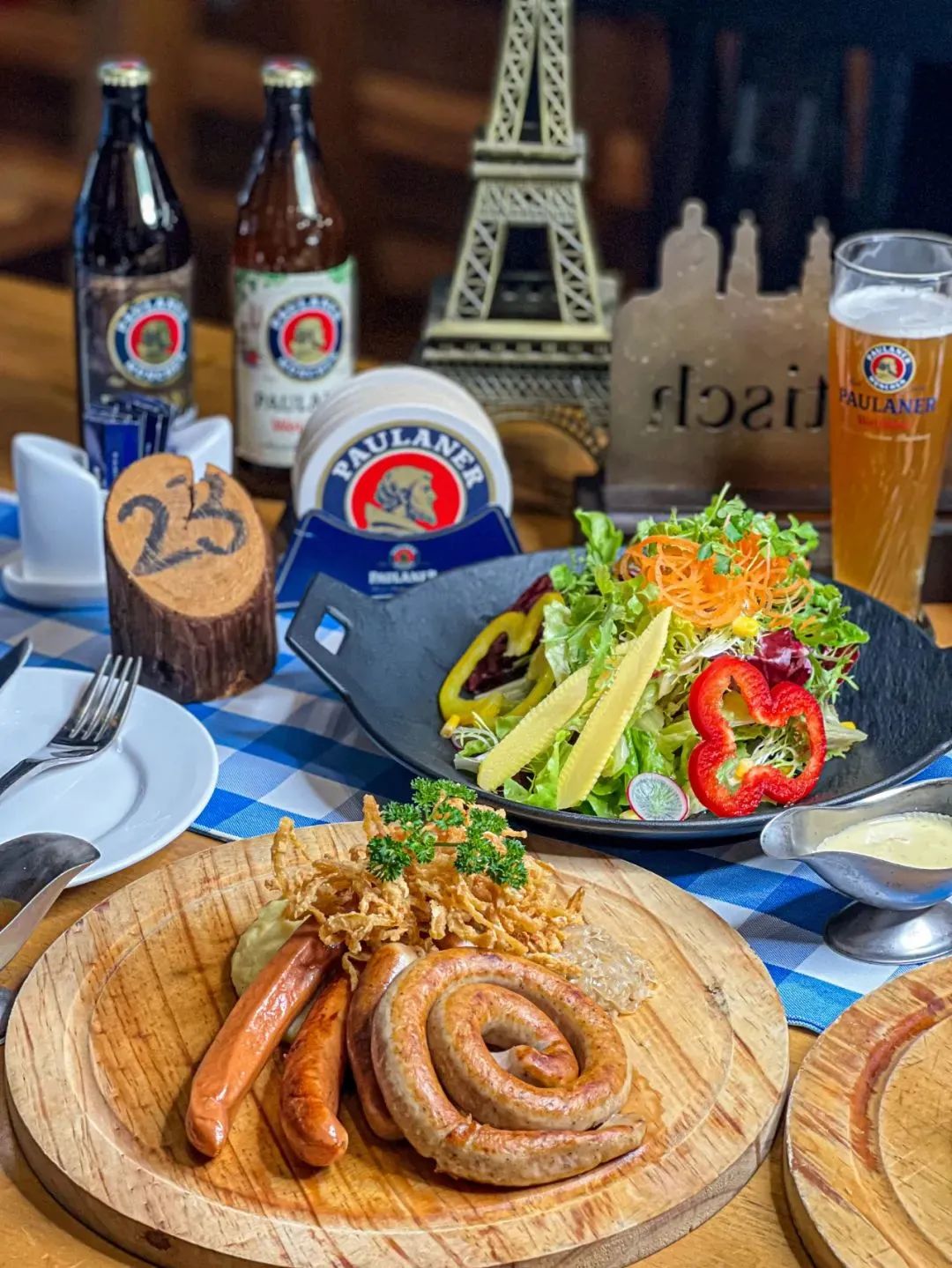 如果你觉得一种肉太过单调,点太多又浪费,不妨试试巴伐利亚综合肉盘,猪膝+肉糕+三种香肠,让你一次吃过瘾。这份香肠拼盘汇集了德国菜的精华,一口咬下去又香又嫩~