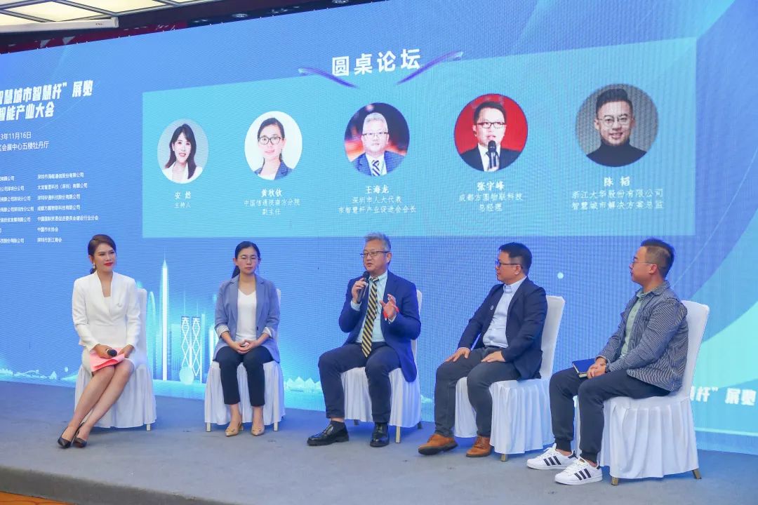 圆桌论坛上王海龙会长、中国信通院南方分院副主任黄秋钦、浙江大华股份有限公司智慧城市解决方案总监陈韬、成都方圆物联科技有限公司总经理张宇峰,围绕“智慧城市”如何就物联网发挥何种作用,围绕如何就人工智能AI在未来的智慧城市中发挥的作用,以及智慧杆在未来城市治理及管理等问题展开高端对话。