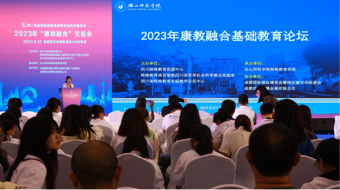 9月22日下午,“2023年康教融合·基础教育论坛”在第二届成都国际福祉博览会现场举行。论坛由特殊教育语言智能四川省哲学社会科学重点实验室、四川特殊教育资源中心、四川省特殊教育实验教学示范中心联合主办,乐山师范学院特殊教育学院承办。来自全国7所举办教育康复学专业的高校的专家、全省各市(州)和县(市、区)特校的领导和老师、各地康复机构的负责人和工作人员等200余人参加了论坛。论坛由四川特殊教育资源中心副主任杨鹃主持。