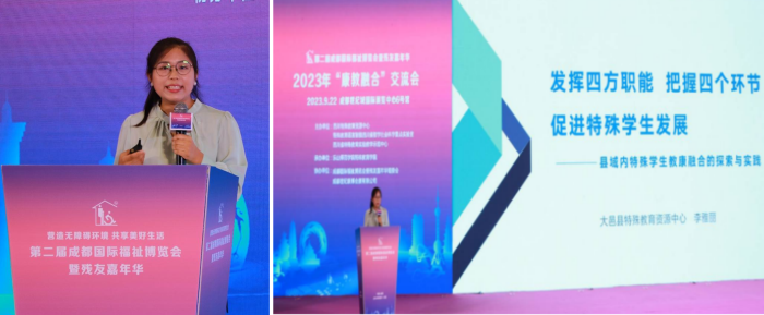 成都市大邑县特殊教育学校康复部部长李雅丽以“发挥四方职能 把握四个环节 促进特殊学生发展”为题,从政策背景、学生的现实需要、实践中遇见的问题出发,介绍了大邑特校教康融合“4+4”工作模式。她强调要在明确四方(县残疾人教育专家委员会、普通学校和特殊学校、县特殊教育资源中心、县残疾儿童少年定点康复机构联盟)职能的前提下,做好评估安置、方案制定、科学实施、调整优化四个环节的工作。