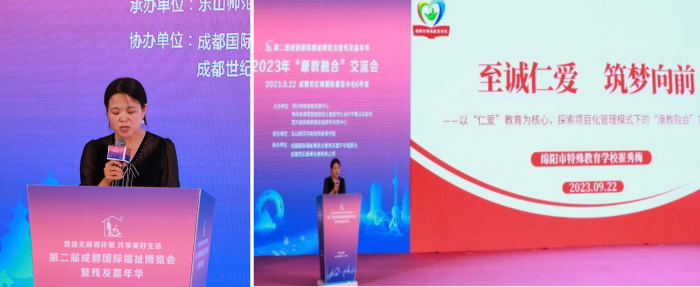 绵阳市特殊教育学校校长崔秀梅以“至诚仁爱 筑梦向前”为题进行了交流。她指出,绵阳特校以仁爱教育为核心,积极营造和谐育人氛围,根据学生的最近发展区定制专门的学习方案,使学生在感到温暖同时最大化提升社会适应能力。她认为要聚焦教师发展,助力教师成长,为康教融合提供专业保障;要开齐开足一般性国家课程,弹性优化艺体课程设置;要开展社会实践,助力康教融合的综合目标服务生活需求;要做到家校携手实施“教育+康复”。