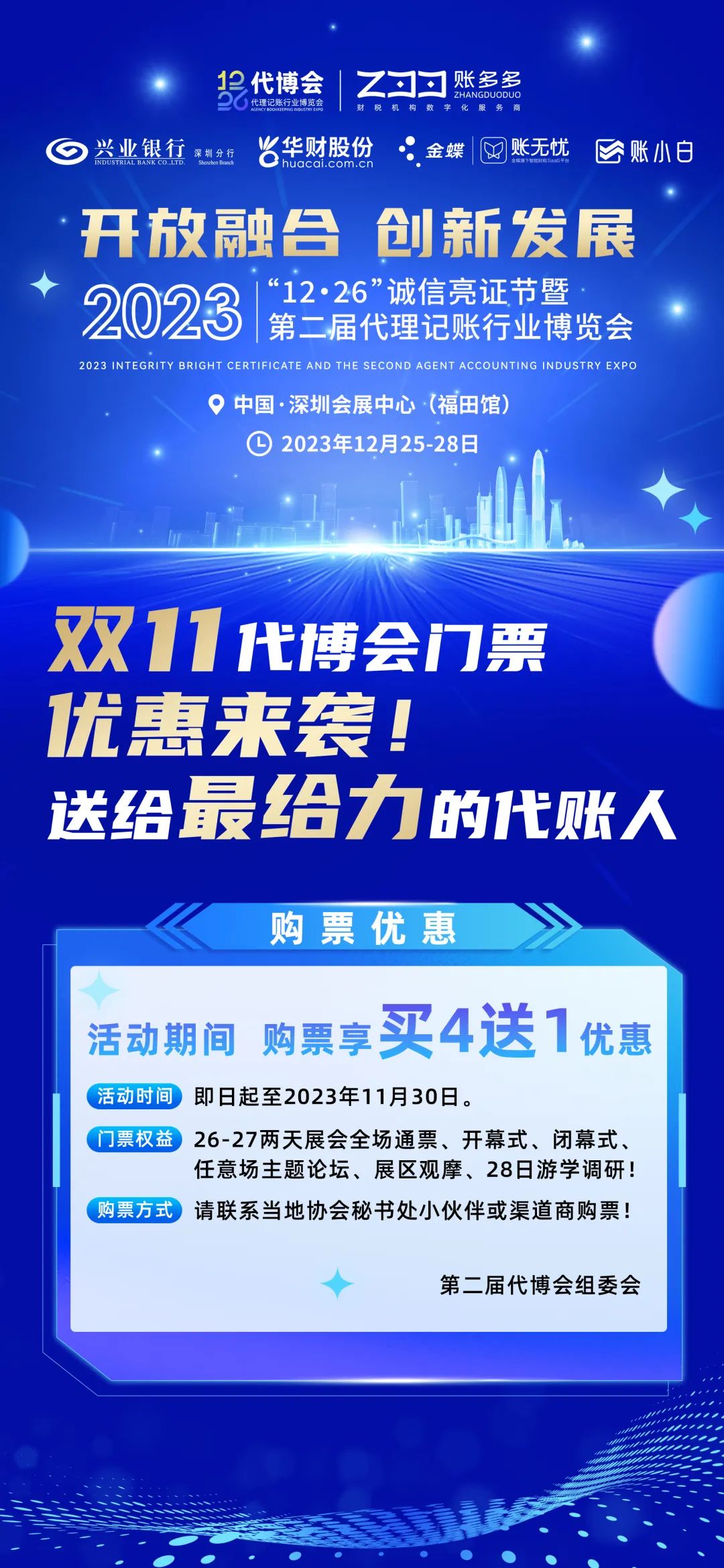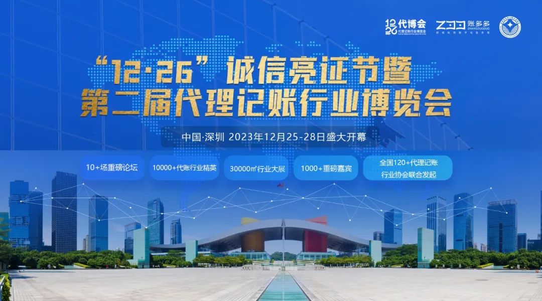 “12·26”诚信亮证节暨第二届代理记账行业博览会将是一场新时代全国性超高规格的行业监管盛会、行业自律盛会、政策宣传盛会;一场推动代理记账全产业链高质量发展的思想盛宴、理论盛宴、实操盛宴;一场代理记账行业数字化、现代化服务产品的超大规模发布大展。深圳市代理记账行业协会将和全国155+联合发起协会一起努力,共同将本届代博会打造成为2023年度最具影响力的代账行业博览会。第二届代博会将在首届代博会基础上,对标国际大展,全面升级扩容,充分学习首届代博会的筹备经验,接好接力棒,广泛借鉴同行业的办展特色,创造新标杆,积极引入“文博会”等多个深圳知名品牌国际性博览会的成功模式,办出新水平,用八大亮点铸就2023年度最具影响力的代账行业博览会。 第二届代博会选择位于深圳市中心交通十分便利的地标性建筑—福田会展中心3号、4号两个展馆办展,布展面积将突破30000平米,可提供300多个展位布展,将为全国代理记账行业搭建全产业链高新技术发布、全新服务产品订购、跨界商贸合作的大平台,创造交流共享、合作共赢的开放融合机会,将吸引300余家与代理记账行业相关的、具有较高知名度和美誉度的全产业链领军企业参展。本届代博会将成为2023年度最具影响力的聚焦代理记账产业集群的专业性大展,展会规模空前庞大。 第二届代博会核心展会时间为12月26-27日两天,展会前一天12月25日将举办全国代理记账行业协会会长、秘书长联席会议。展会后一天12月28日将组织赴华为、腾讯、阿里、抖音、比亚迪等头部科技名企、代理记账标杆企业、大湾区特色景点等地开展游学调研活动。12月24-25日、28-29日四天展会前后时段,组委会将支持参展领军企业在深圳举办全国直营/加盟商培训会议,进一步拓展参展成果。第二届代博会的展期将扩容至4-6天时间,展会内容非常丰富精彩。第二届代博会的主题为:开放融合,创新发展。寓意本届代博会将引领代理记账行业进入新发展阶段,贯彻新发展理念,构建新发展格局。立足代理记账行业主责主业,打开行业之门,迎接发展新风,面向新时代各行各业对外开放,广泛吸纳代理记账全产业链及各行各业发展的新思想、新技术、新动能、新趋势,拥抱监管,迎接转型,推动全行业实现跨界融合,创新发展,展会主题极具新时代特色。 第二届代博会将在第一届代博会主要议程设计的基础上,全面进行改进优化,将举行开幕式、“12·26”诚信亮证节、研究项目启动仪式、2023中国代理记账行业发展报告发布、高峰论坛、平行峰会论坛、大型展会、联席会议、2023代理记账行业年终秀、闭幕式、游学调研、展商培训等十余个板块展会活动。既保留主要议程上的经典传承,又赋予新的议程内容,整个展会议程将紧密围绕推动代理记账行业转型升级、创新发展进行设计安排,为期4天的博览会时间紧凑,安排科学,内容丰富,看点突出。第二届代博会将邀请国家和地方政府主管部门领导、北国会、上国会、厦国会、扬州税院、武汉大学等国内财税专业顶级高等院校知名专家学者、各省市县区代理记账行业协会会长、秘书长、代理记账行业领军企业领导层、华为、阿里、腾讯、百度、万科、小米、抖音、比亚迪、兴业银行、账多多、创业护航、金蝶、用友、金财数字、税友软件、亿企赢、云账房、华财股份、财小白、账小白、账无忧、七五一等国内头部科技企业精英、跨界大咖、网红达人、著名投资人以及知名会计师事务所、税务师事务所、律师事务所、财税科技等跨界融合的企业服务机构负责人上千位重磅嘉宾齐聚盛会,可谓大咖云集、阵容非常强大。第二届代博会将举办2场高峰论坛和12场平行峰会论坛,多场高端沙龙和业务洽谈会,与会重磅嘉宾、知名学者、行业专家、跨界大咖、头部精英、网红达人、著名投资人将呈现代理记账行业和企业服务产业140+热点课题权威解读,内容涵盖新时代代账行业开放融合、创新发展、数字化财税、人力资源开发、大客户开发、市场化营销、高质量发展、规范化执业、资本化赋能、保值增值业务、国际化业务、政府项目开发、精细化运营、人工智能应用等方方面面,兼具行业最新财税政策信息解读、行业发展趋势洞察研讨、行业人才培养课程体系建设、企服实务理论培训、实战经验交流分享、产业链合作促进和企业品牌传播,将为推动代理记账行业和企业服务产业实现科技创新、转型升级,高质量发展全方位赋能。第二届代博会为期2天的代理记账行业和企业服务产业大型展会将发布1000余款代理记账行业数字化、现代化服务新品爆品,各地特色资源一手对接,深圳将成为全国代理记账行业服务新品的“首发地”,新技术的“路演平台”,创造出行业发展的新视野、新趋势、新模式、新赛道、新动能、新机遇,发布新品、获取订单、拓展市场、签约合作,一气呵成,将有力推动代理记账行业快速实现科技创新、转型升级、高质量发展,大步奔向全行业实现现代化的总目标。为集思广益、群策群力办好第二届代博会,我们全国155+联合发起协会已联名向全国近千家代理记账行业协会、十万余家代理记账机构、百万名代理记账同行发出参会、参展邀请,预计参会人数将突破20000人次。第二届代博会将是一场超高规格、超强阵容、超大规模、领先水平的代理记