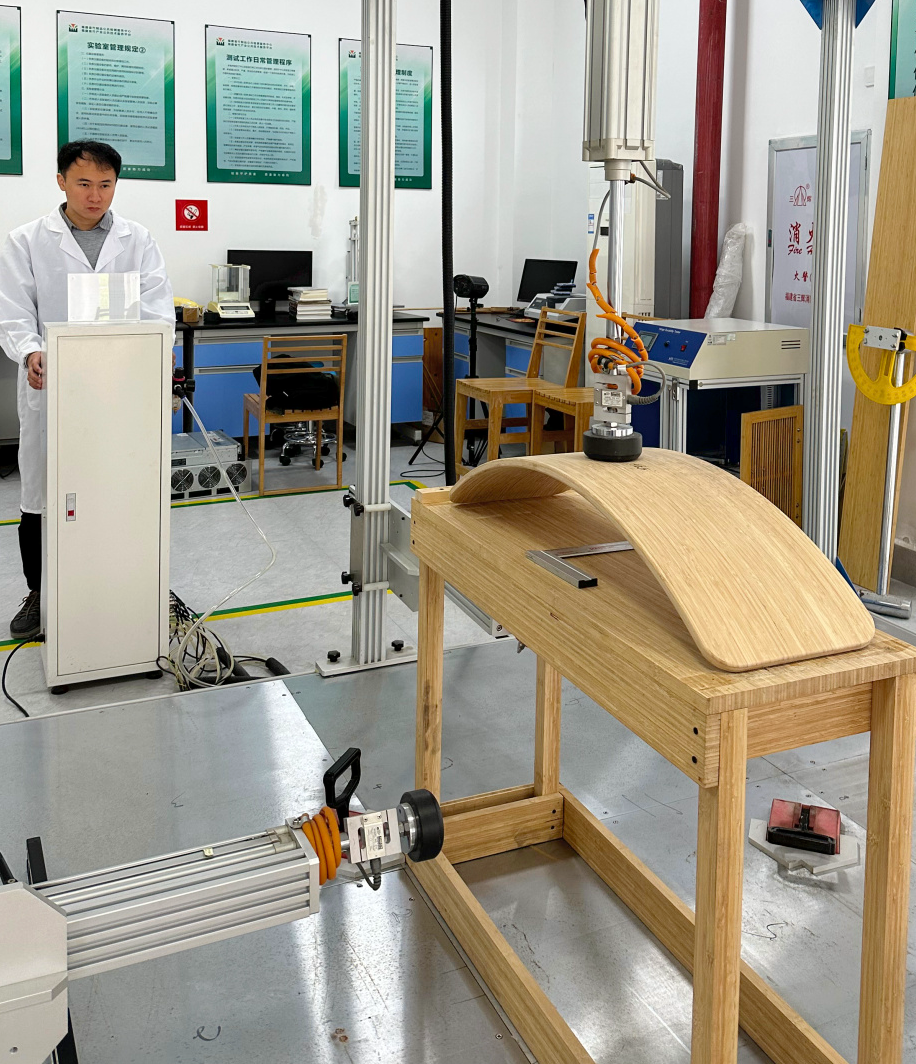 我们走进永安市竹产业研究院,工程师范志宇正忙着为企业送来的一款竹制健身板产品进行压力和耐受力频次测试。