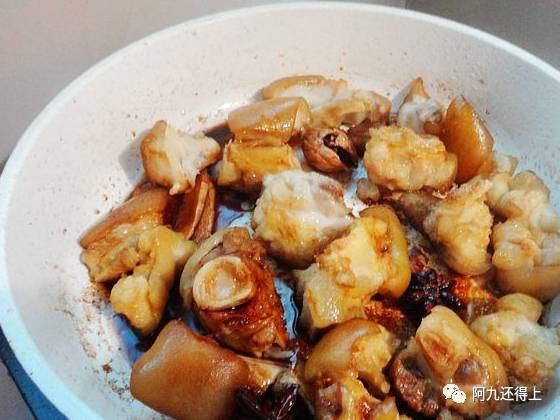 草果等香料炒出香味后放入猪蹄翻炒一会,猪蹄炒干水分冒油脂后放入一小勺五香粉,一汤匙生抽和少许老抽翻炒上色。